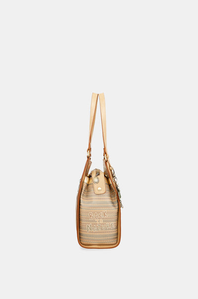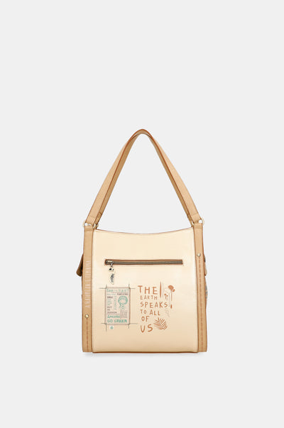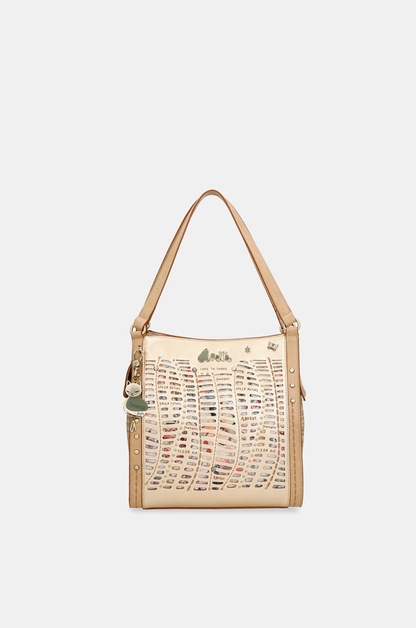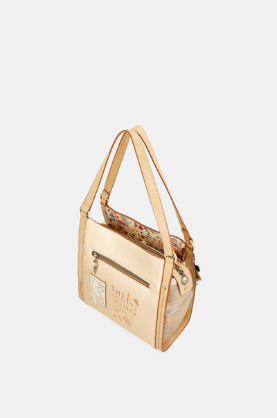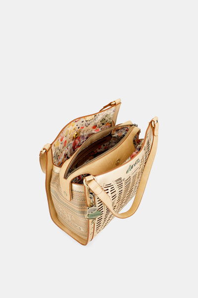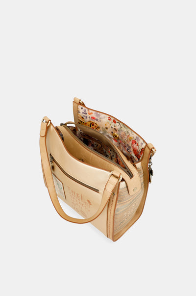 Are 2 compartimente independente. Este o geantă de mărime medie-mare cu buzunar la spate. Materialul are o rigiditate moale care menține forma genții, creând o piesă elegantă și confortabilă. Geanta are două bretele de umăr. Interiorul este căptușit cu un material original imprimat cu motive din colecție și dispune de buzunare.
