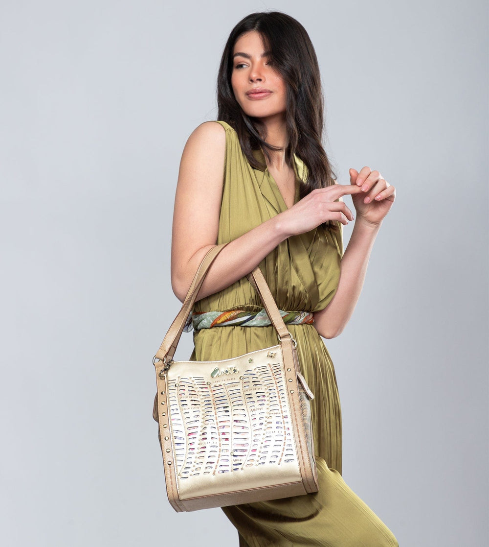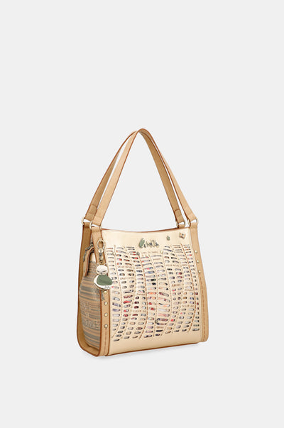 Este un model auriu care combină în designul său un imprimeu multicolor original inspirat de elemente din natură și fluturi. Are părți imprimate combinate cu material decupat și material simplu, amestecate cu fraze inspiraționale imprimate și alte detalii.