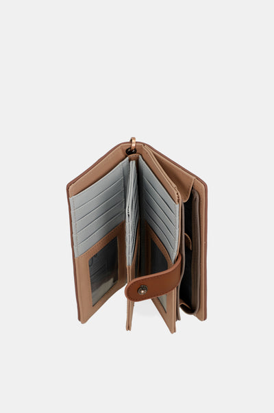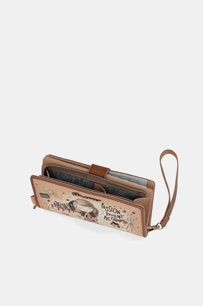 Acest portofel de dimensiuni mari are două compartimente principale: cel din spate, unde există un portmoneu mare și spațiu pentru bancnote, carduri sau documente, și cel de sus cu închidere cu fermoar pentru a păstra monedele în interior. Întregul interior este căptușit. În plus, are un mâner pentru o transportare ușoară.