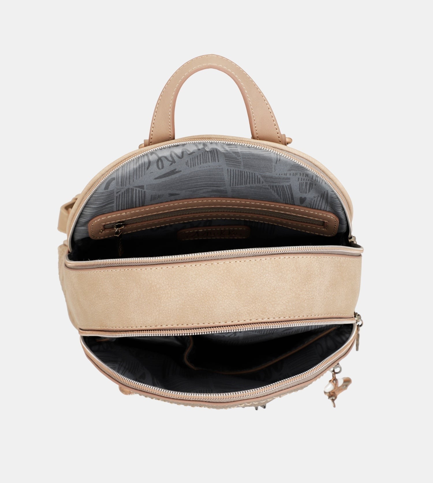 Acest rucsac mediu are doua compartimente independente, ambele cu inchidere cu fermoar, cu interior si buzunare captusite. In plus, are si buzunare in fata si in spate. Mânerele sale sunt reglabile la diferite lungimi, astfel încât se adapteaza la diferite înaltimi.
