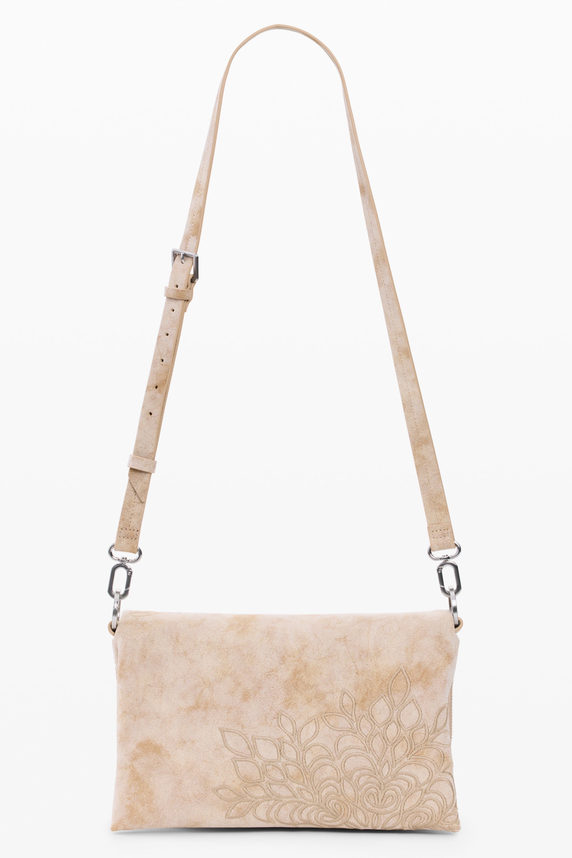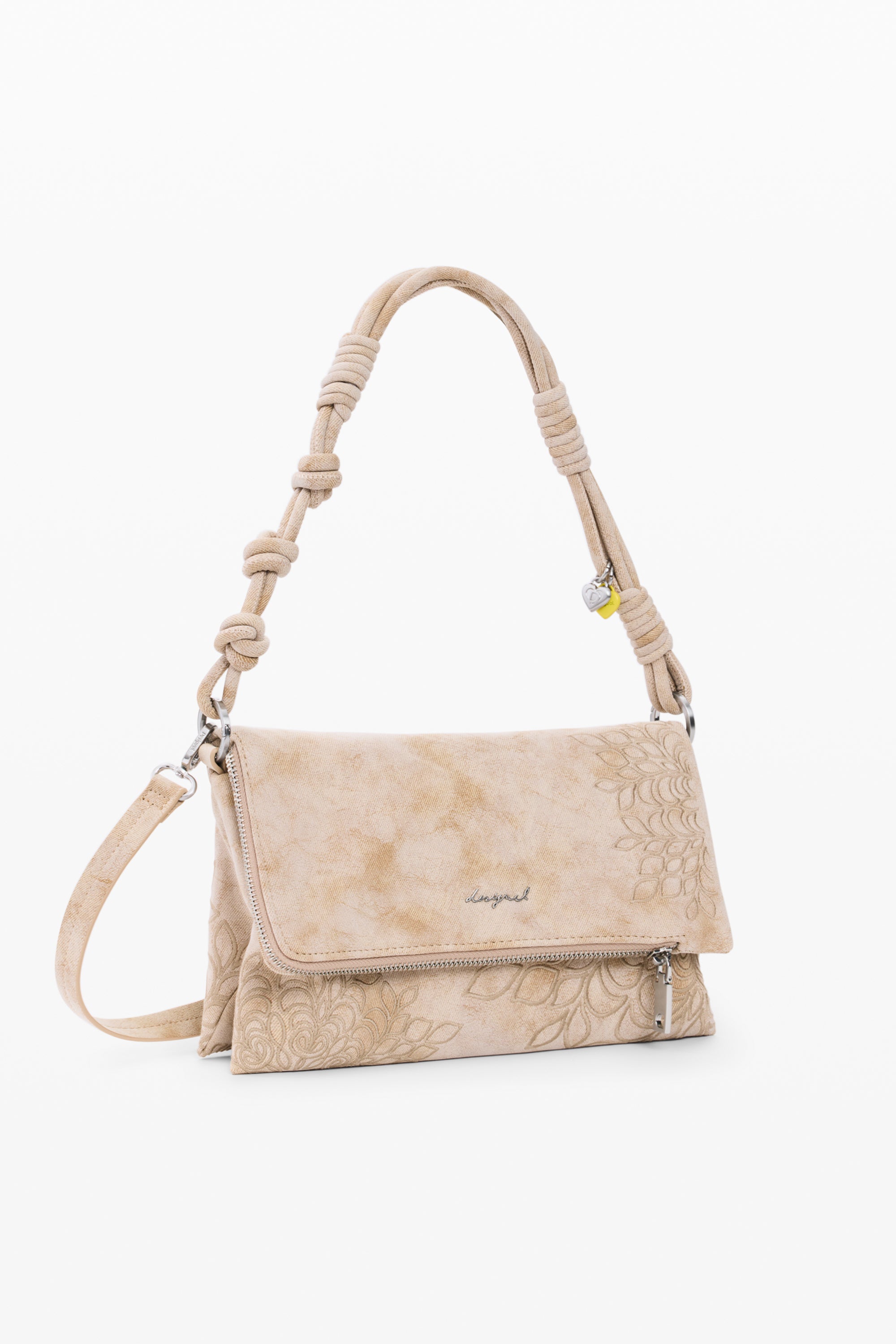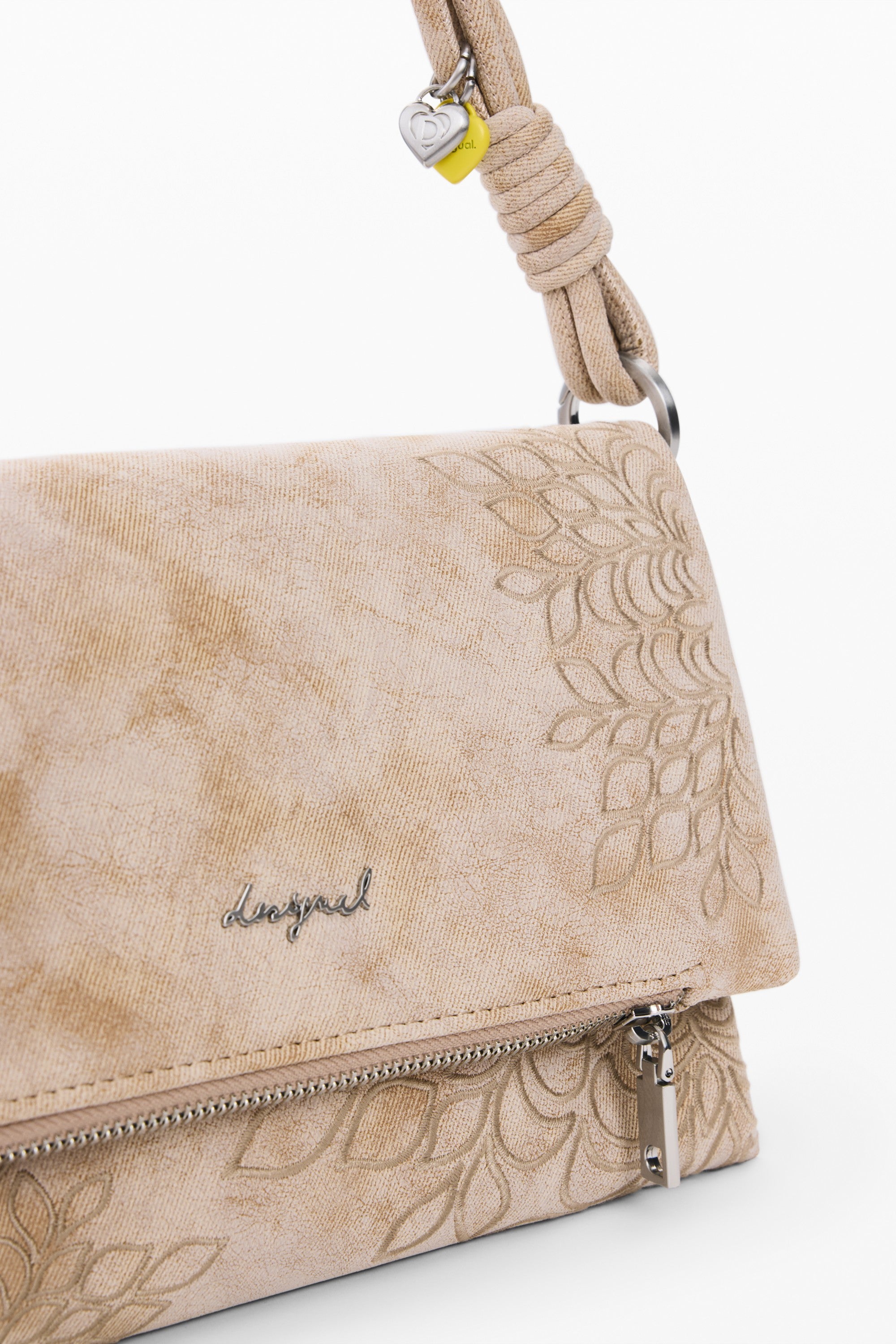 Geantă medie cu clapetă, cu detalii brodate, buzunar interior cu fermoar, logo metalic gravat și bretele interschimbabile.