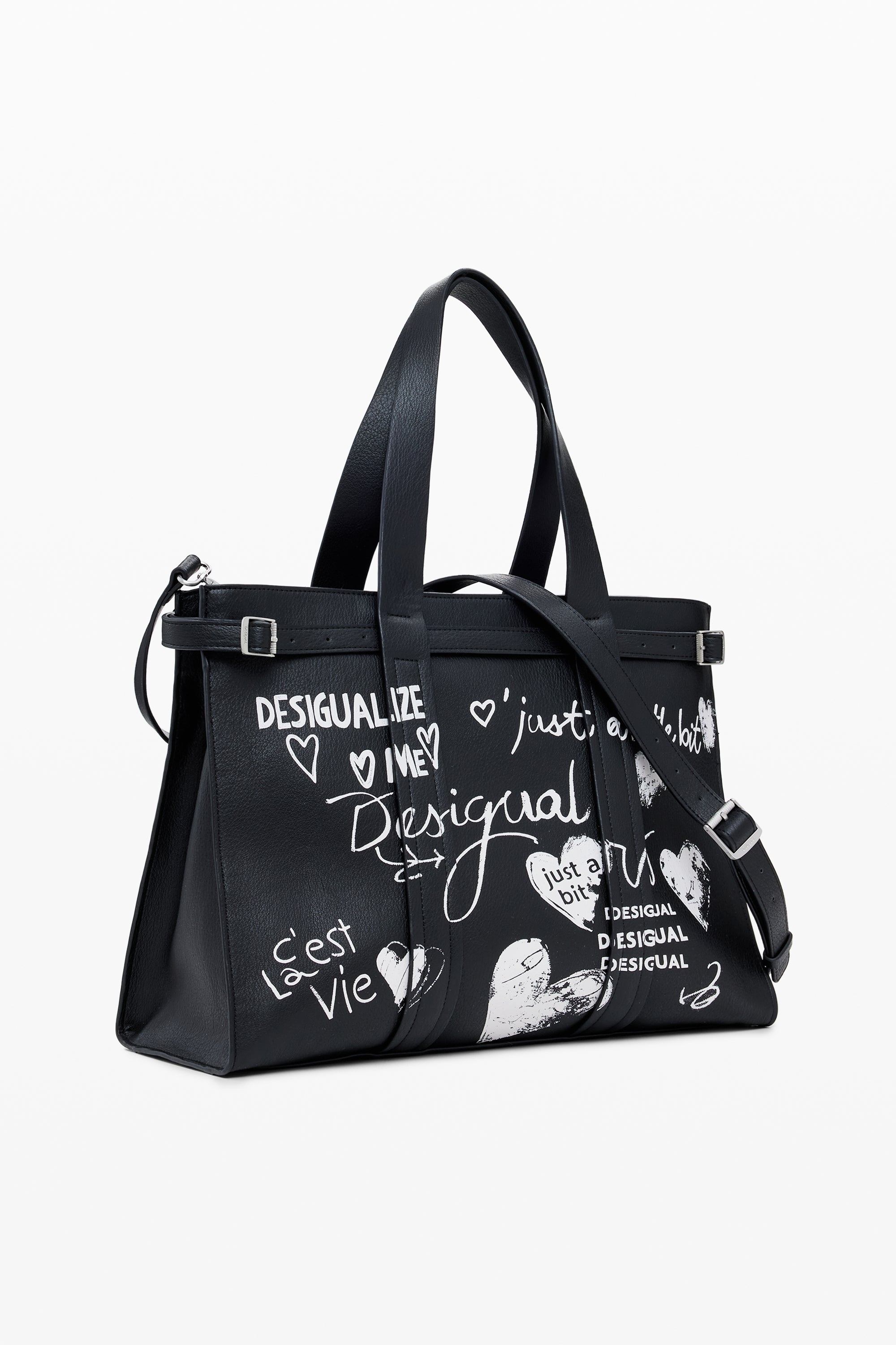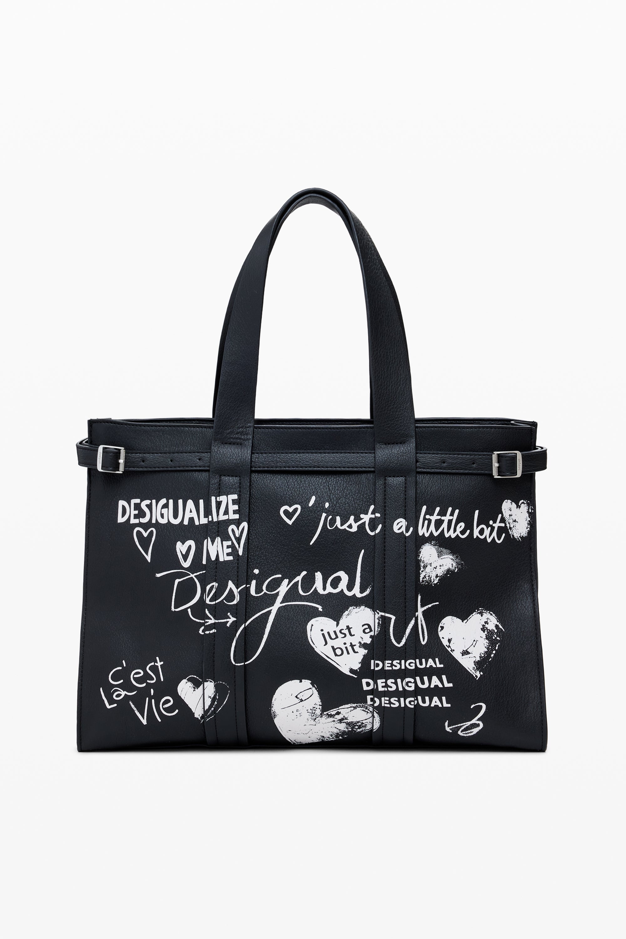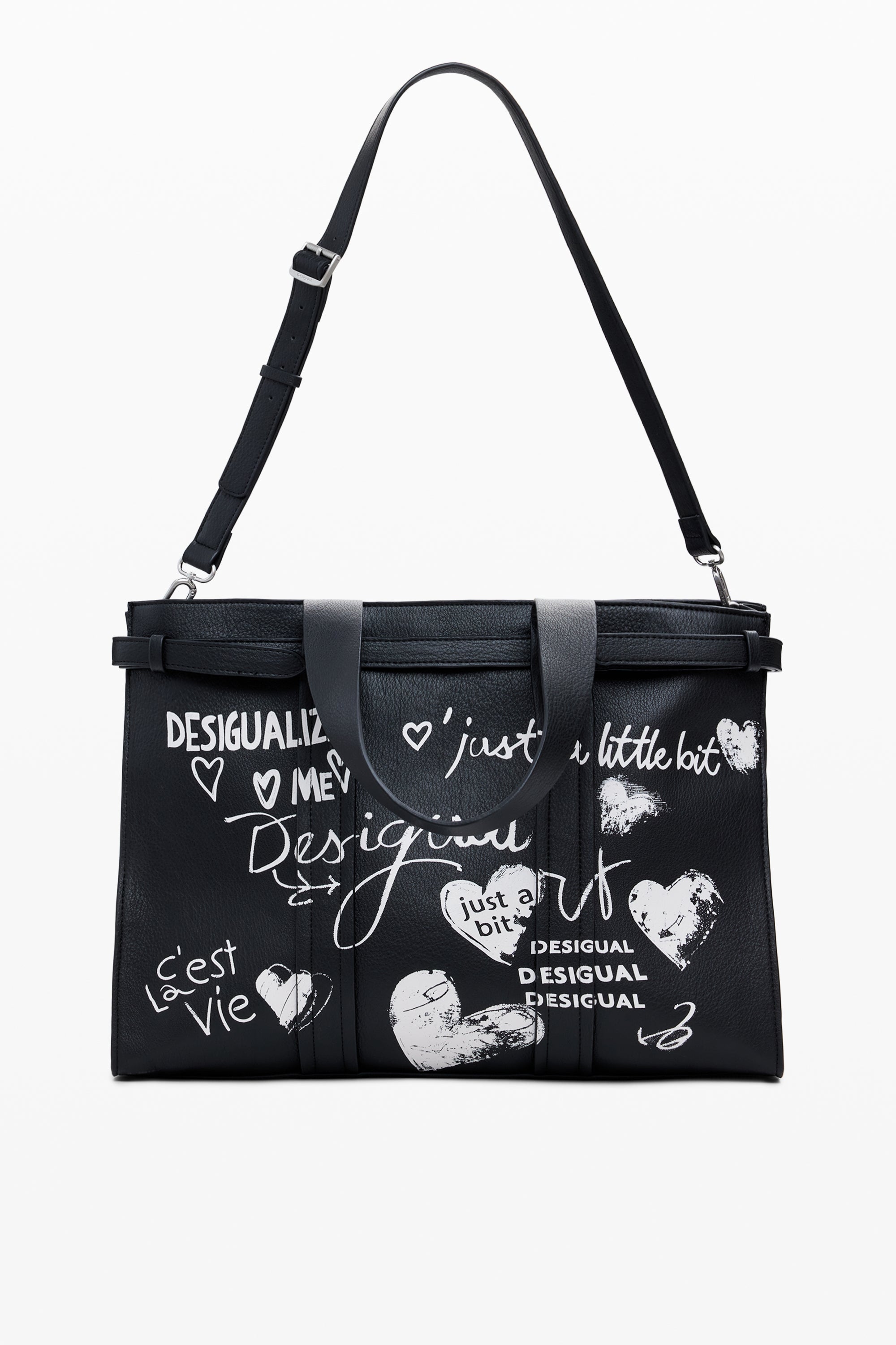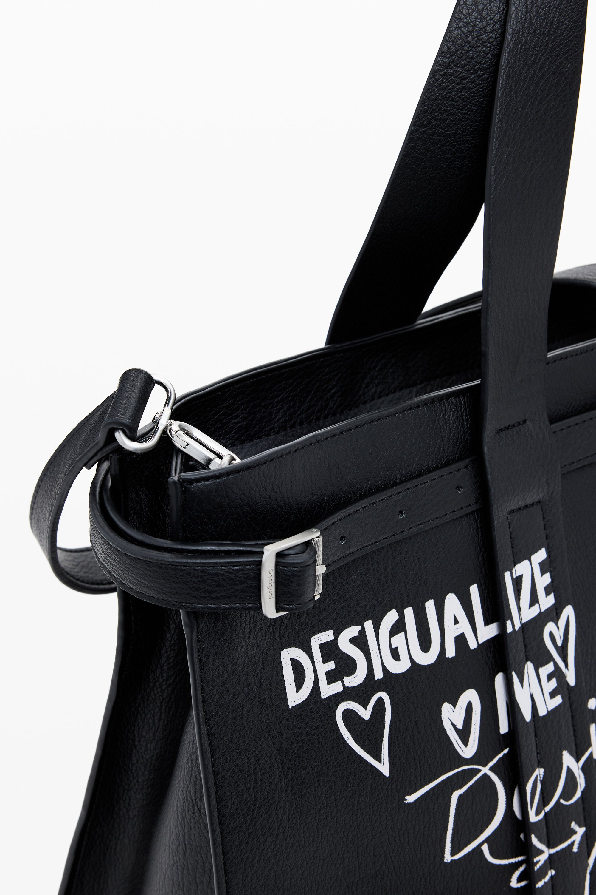 Geantă supradimensionată, tip shopper, din piele ecologică uni, cu imprimeu tip mâzgăleală scrisă de mână.