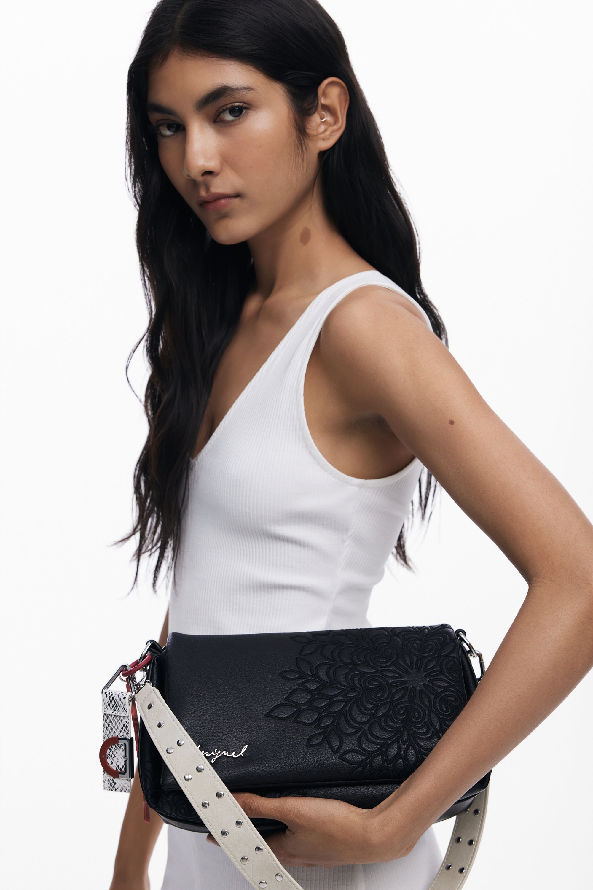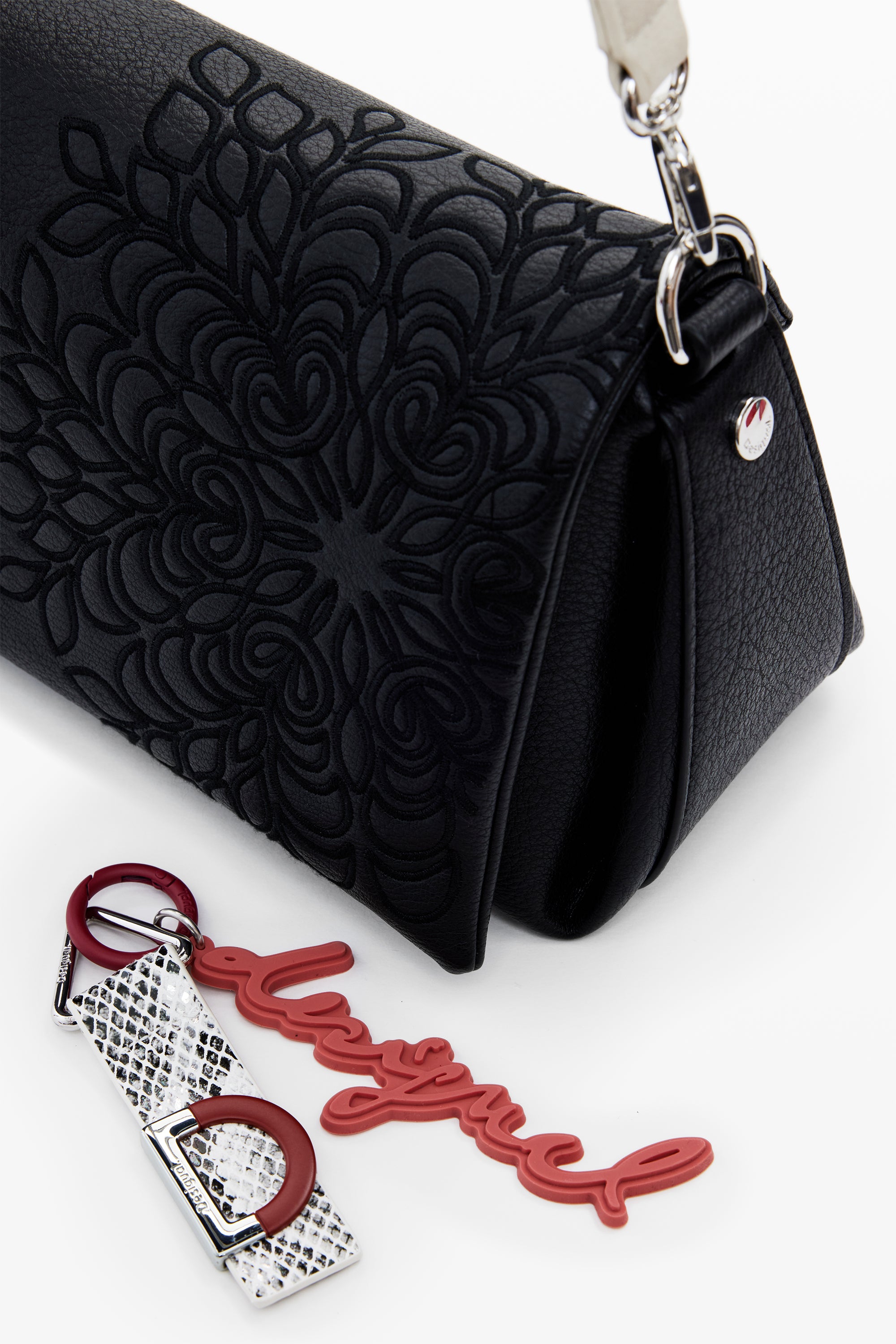 Geantă de mărime medie, tip crossbody, din piele ecologică, cu detalii brodate, mânere interschimbabile, detalii metalice cu ținte și închidere cu fermoar și clapă.