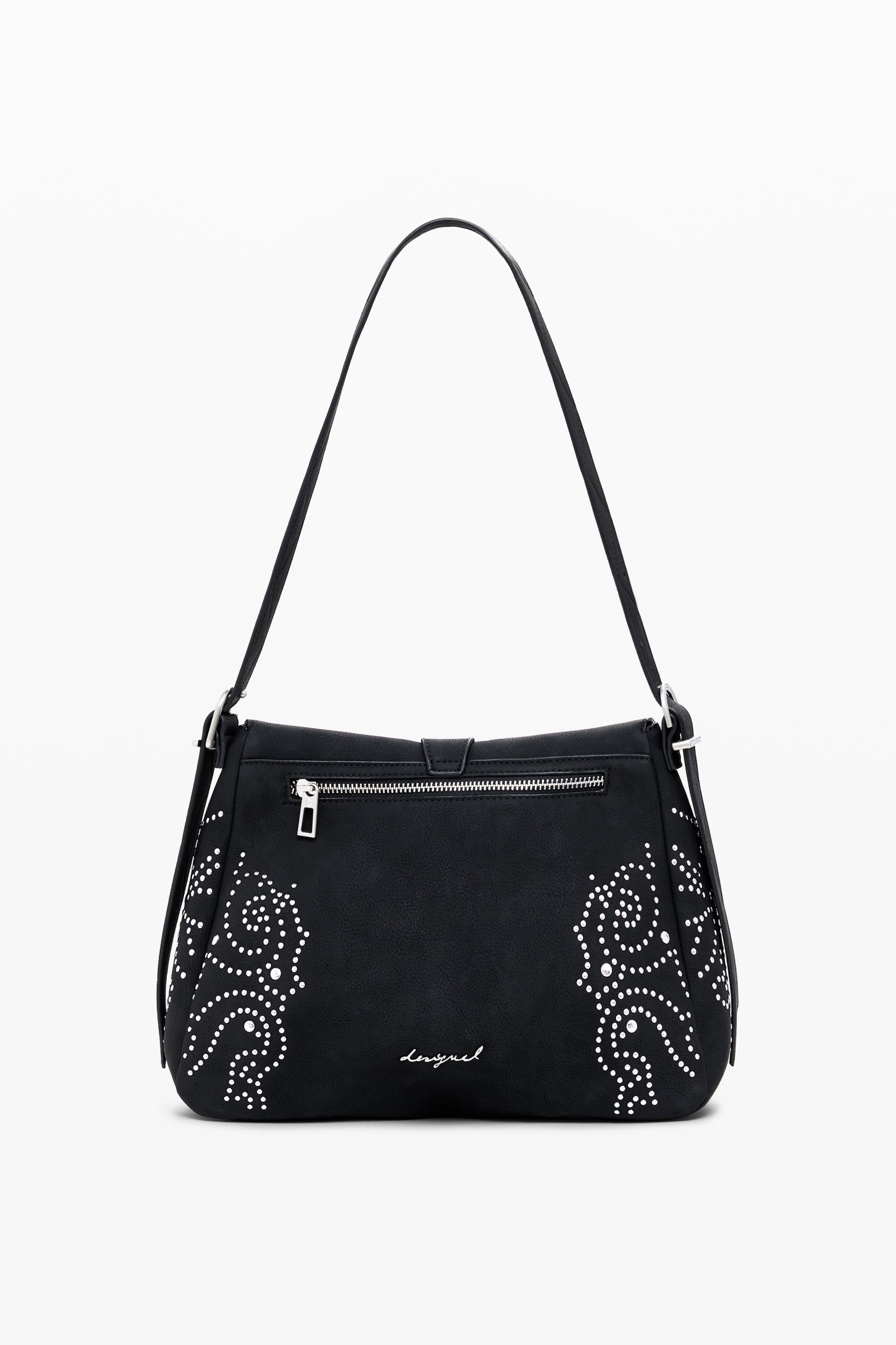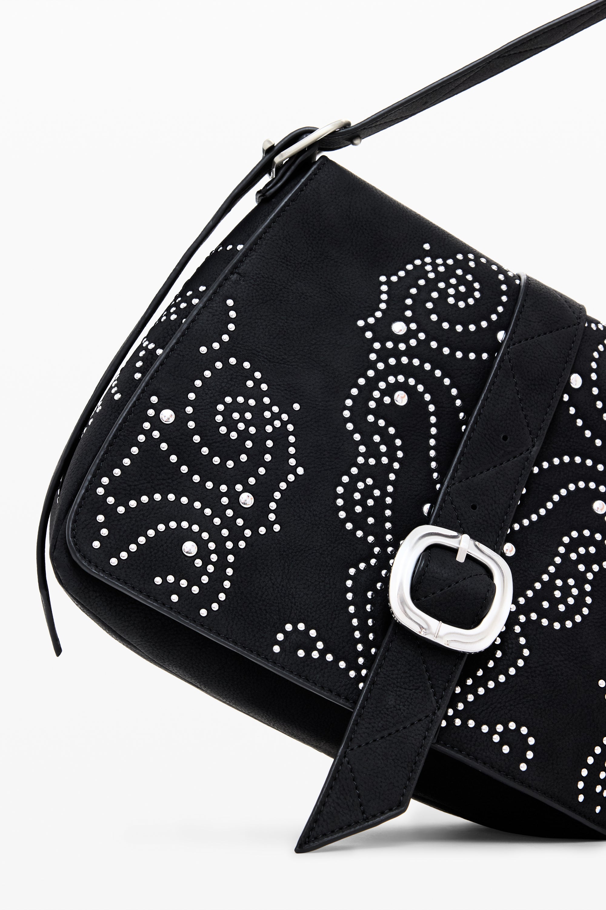 Geantă tip crossbody din piele ecologică, culoare uni, cu detalii metalice, curea reglabilă și închidere cu fermoar.
