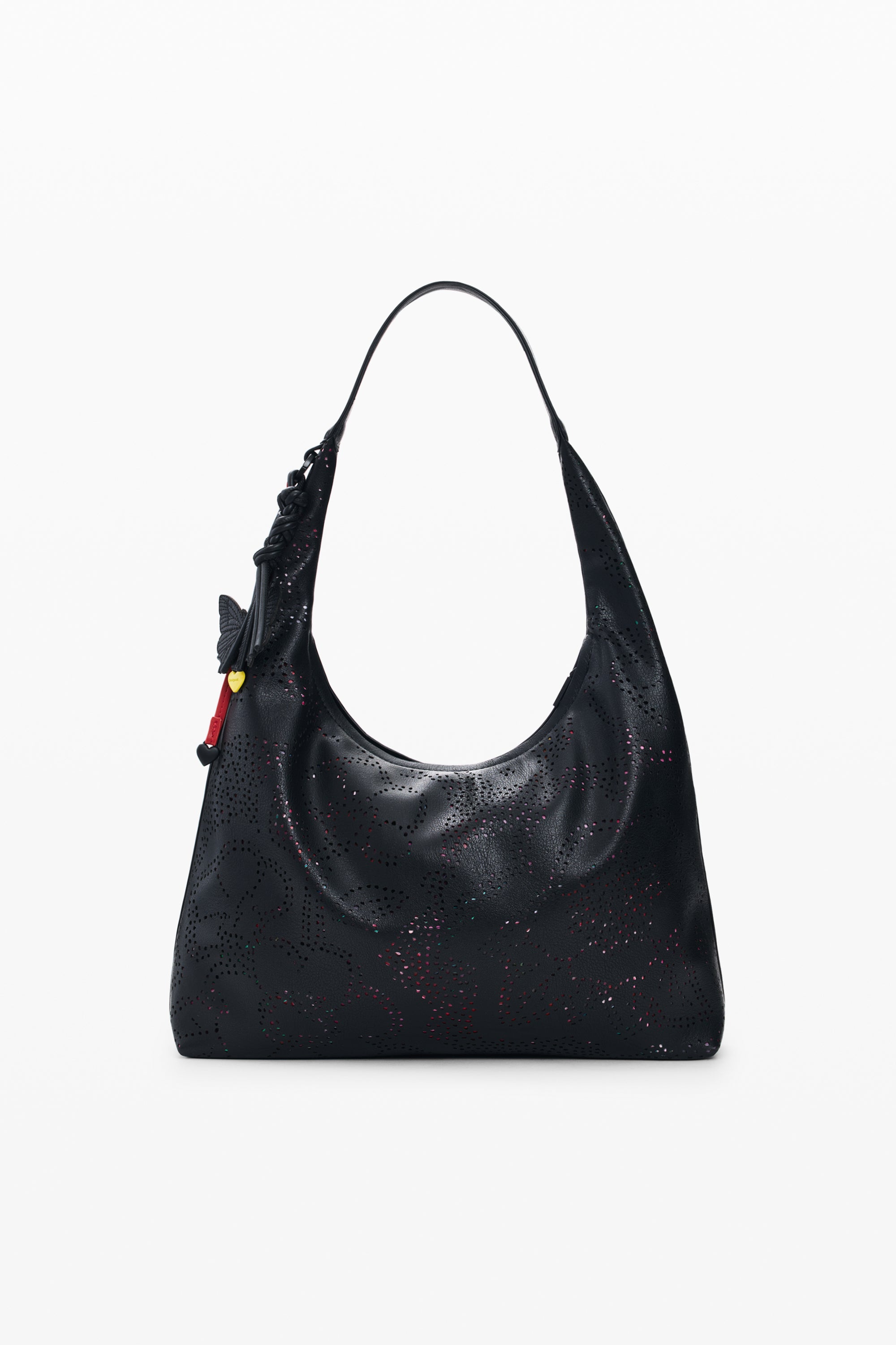 Geantă medie perforată cu flori cu efect de piele peste țesătură imprimată, cu mâner fix, mâner împletit detașabil în contrast de culoare și detaliu charm în formă de fluture.