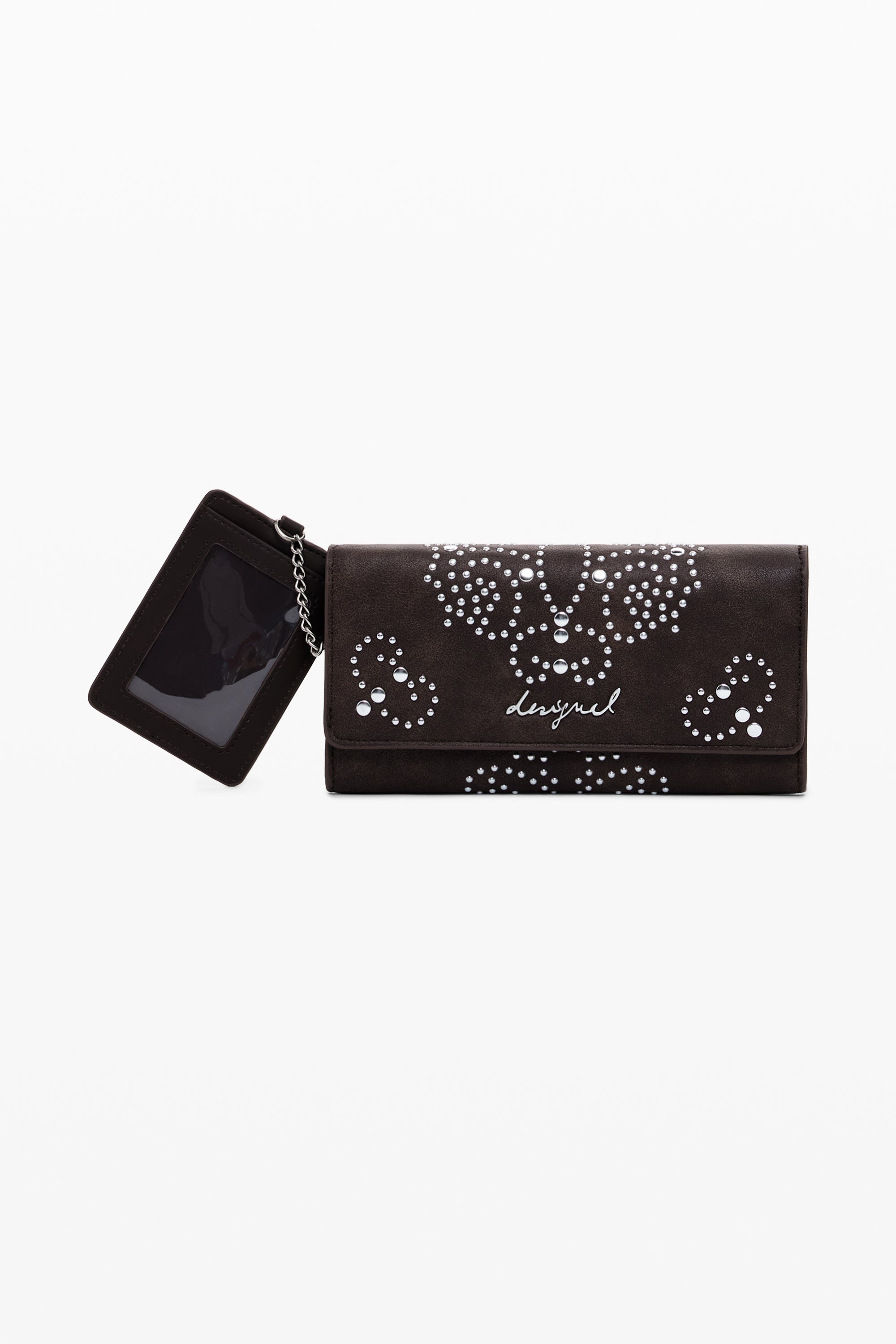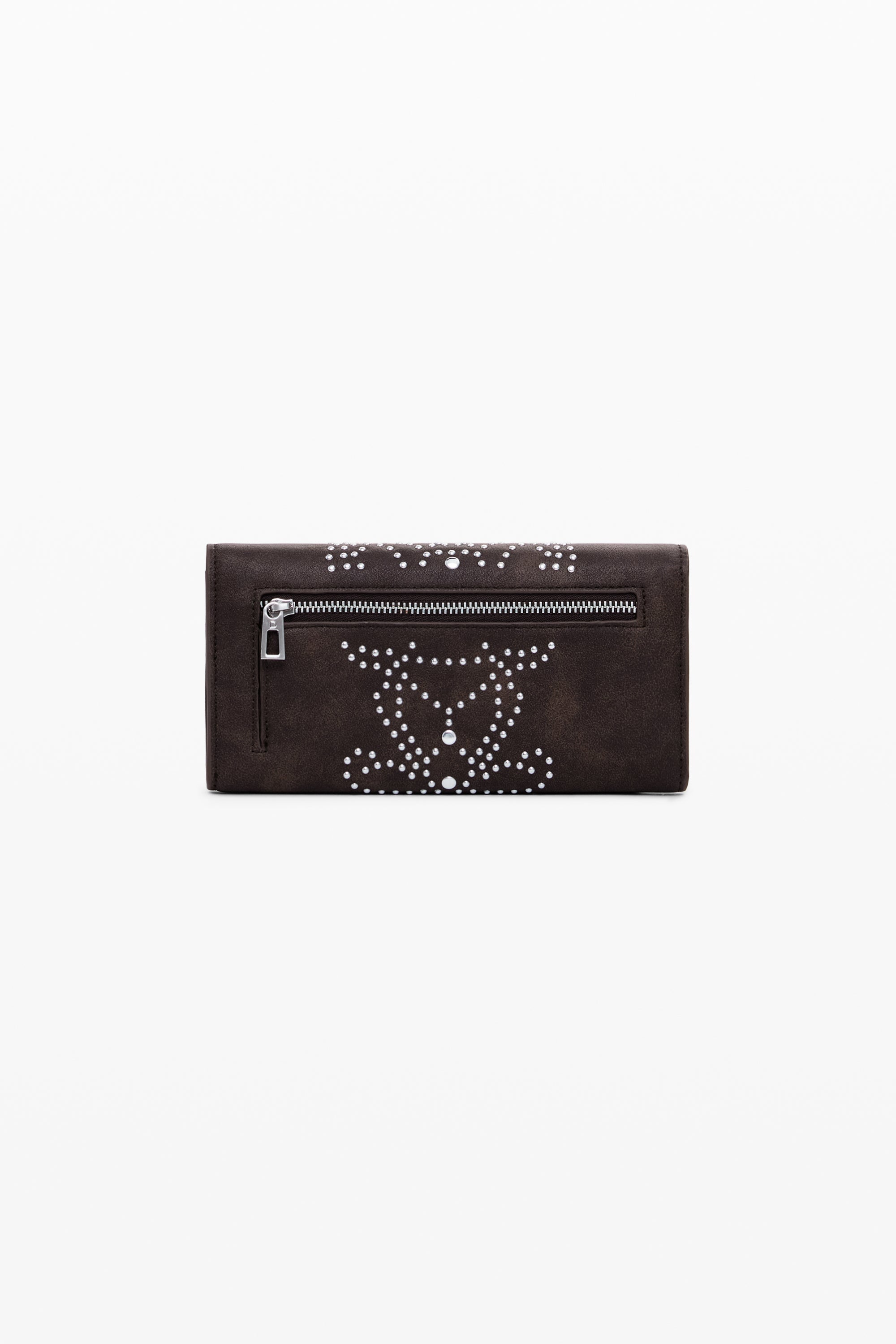Portofel mare, alungit, din piele ecologică, cu ținte, portcard detașabil și diverse compartimente.
