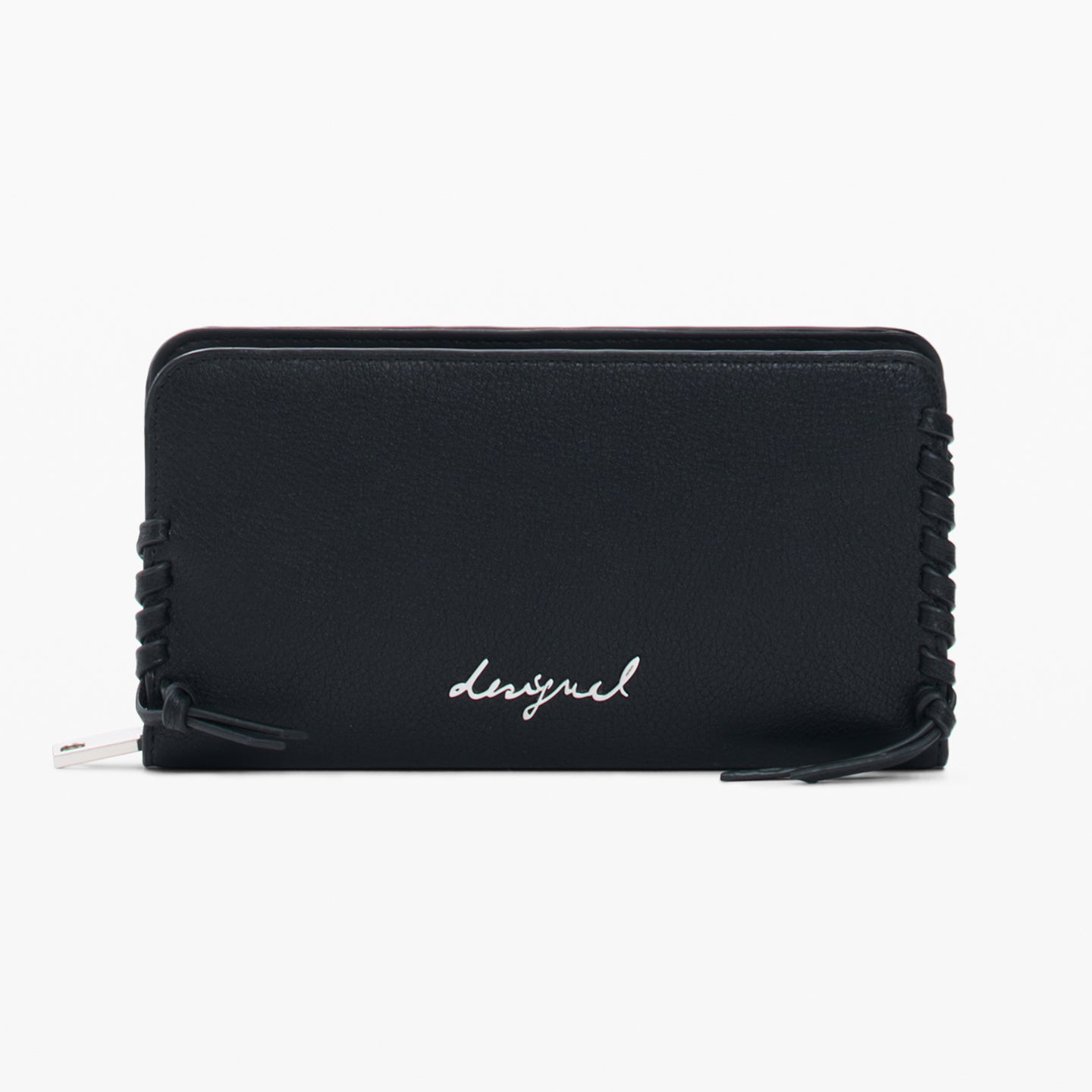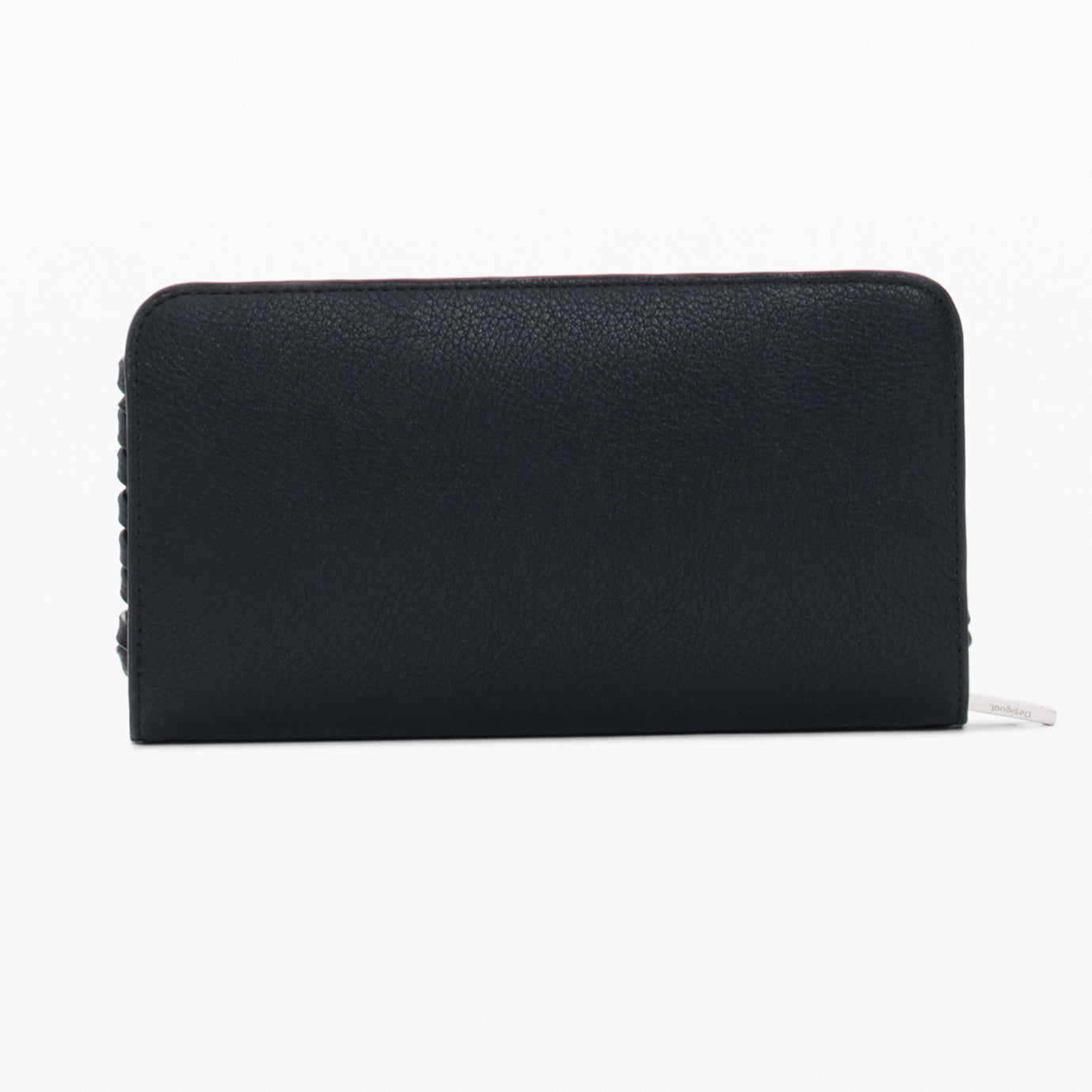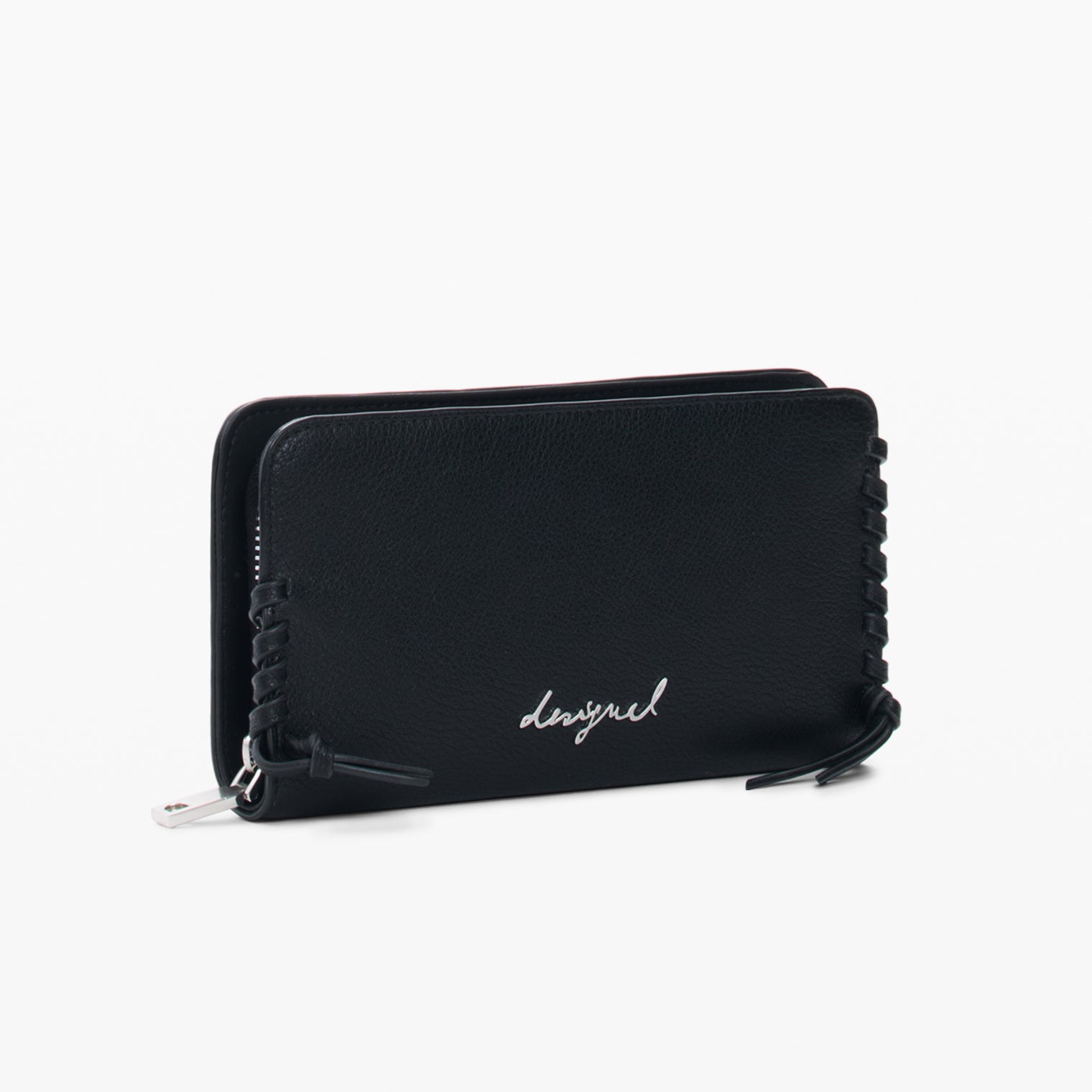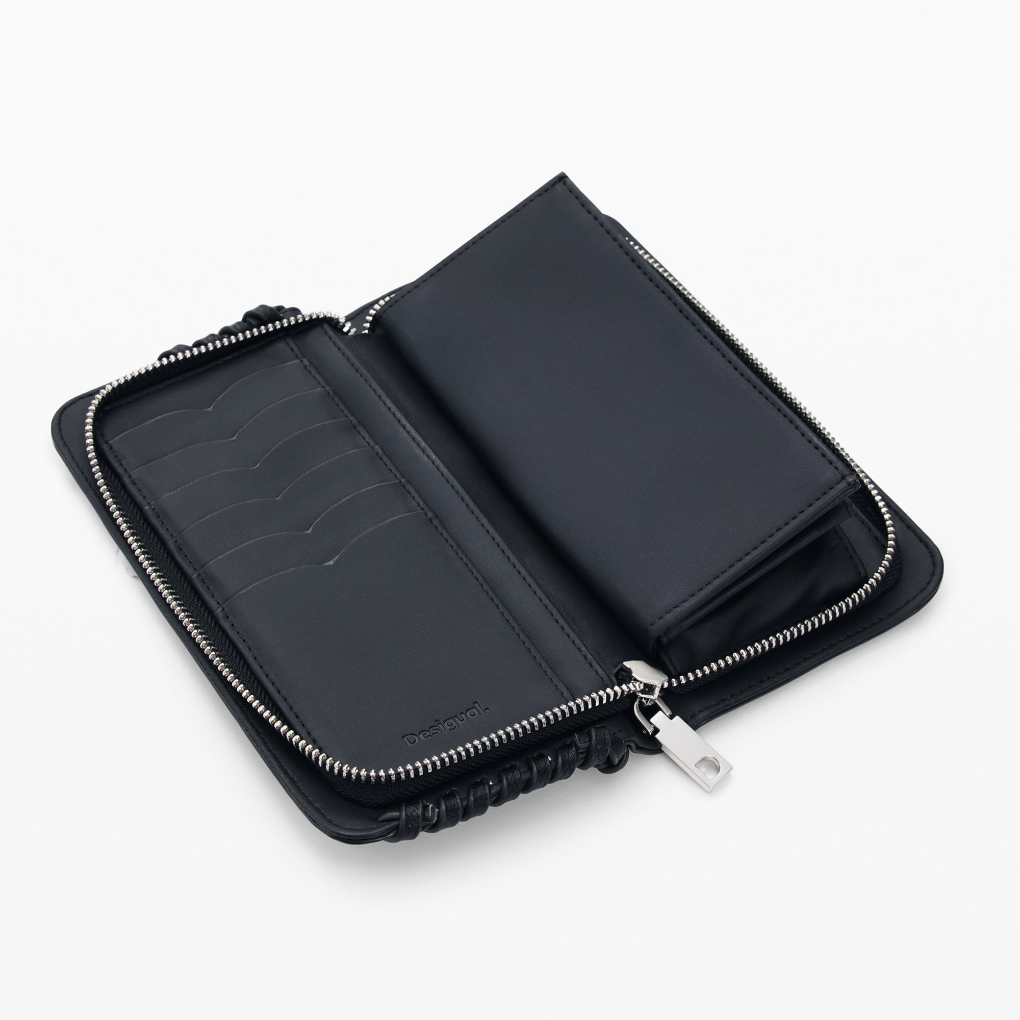Portofel mediu cu compartimente interioare, aplicație cu logo metalic și detalii împletite pe margini.