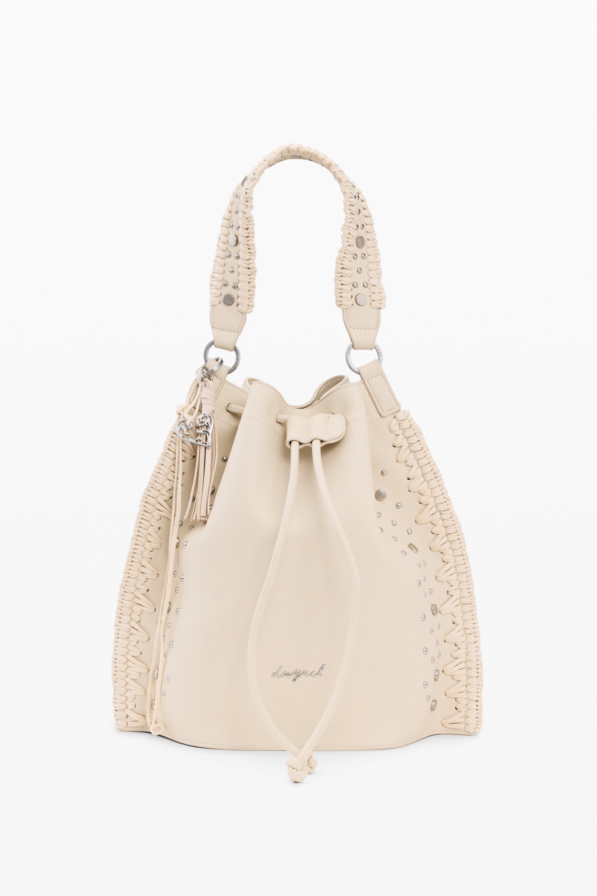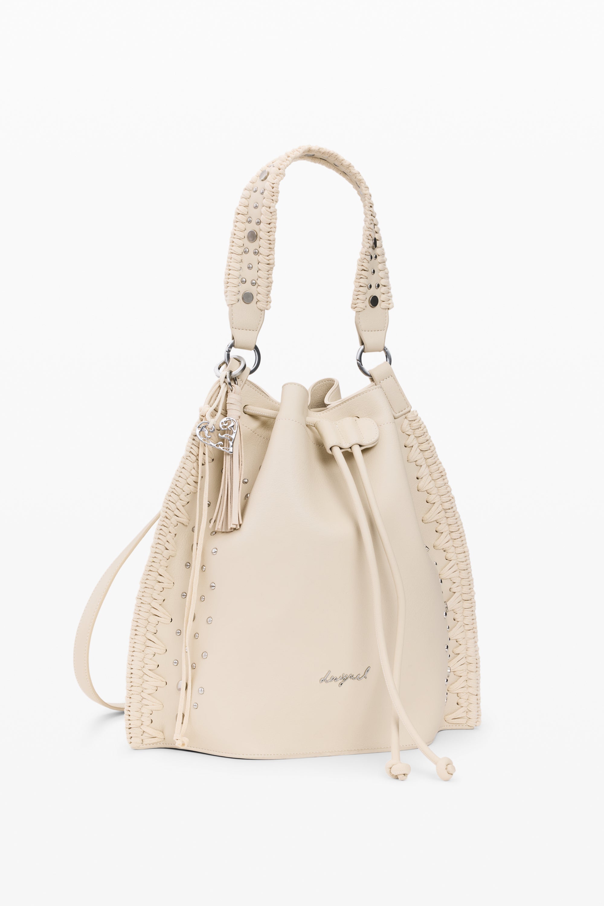 Rucsac mediu din piele sintetică de culoare crem, cu broderii decorative pe laterale și închidere superioară cu șnur reglabil. Design cu mâner lung pentru umăr și detalii metalice vizibile pe fermoare și întărituri.