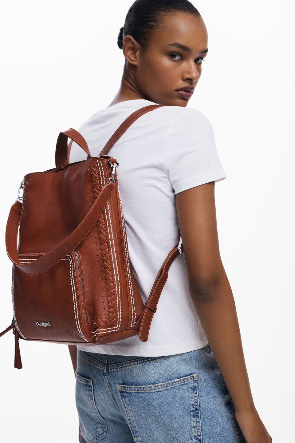 Fie ca optezi pentru gentile elegante cu detalii viu colorate si motive excentrice sau pentru rucsacurile confortabile, dar pline de personalitate, colectia noastra te va cuceri cu varietatea de modele rafinate. De la gentile de umar pana la rucsacurile multifunctionale, fiecare produs Desigual este conceput pentru a-ti exprima individualitatea si pasiunea pentru moda.Rucsac mediu din piele artificiala cu detalii împletite si broderie contrastanta