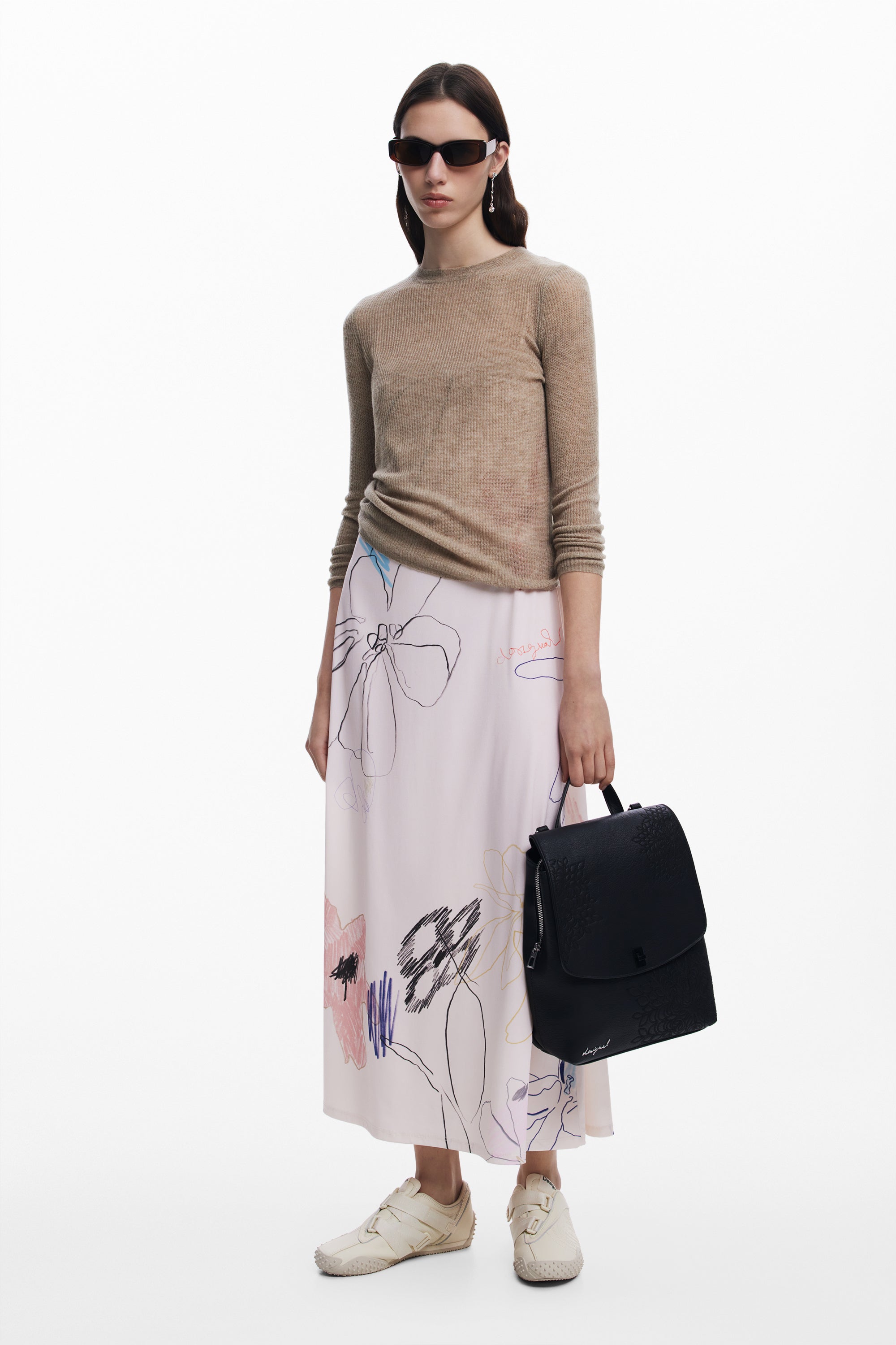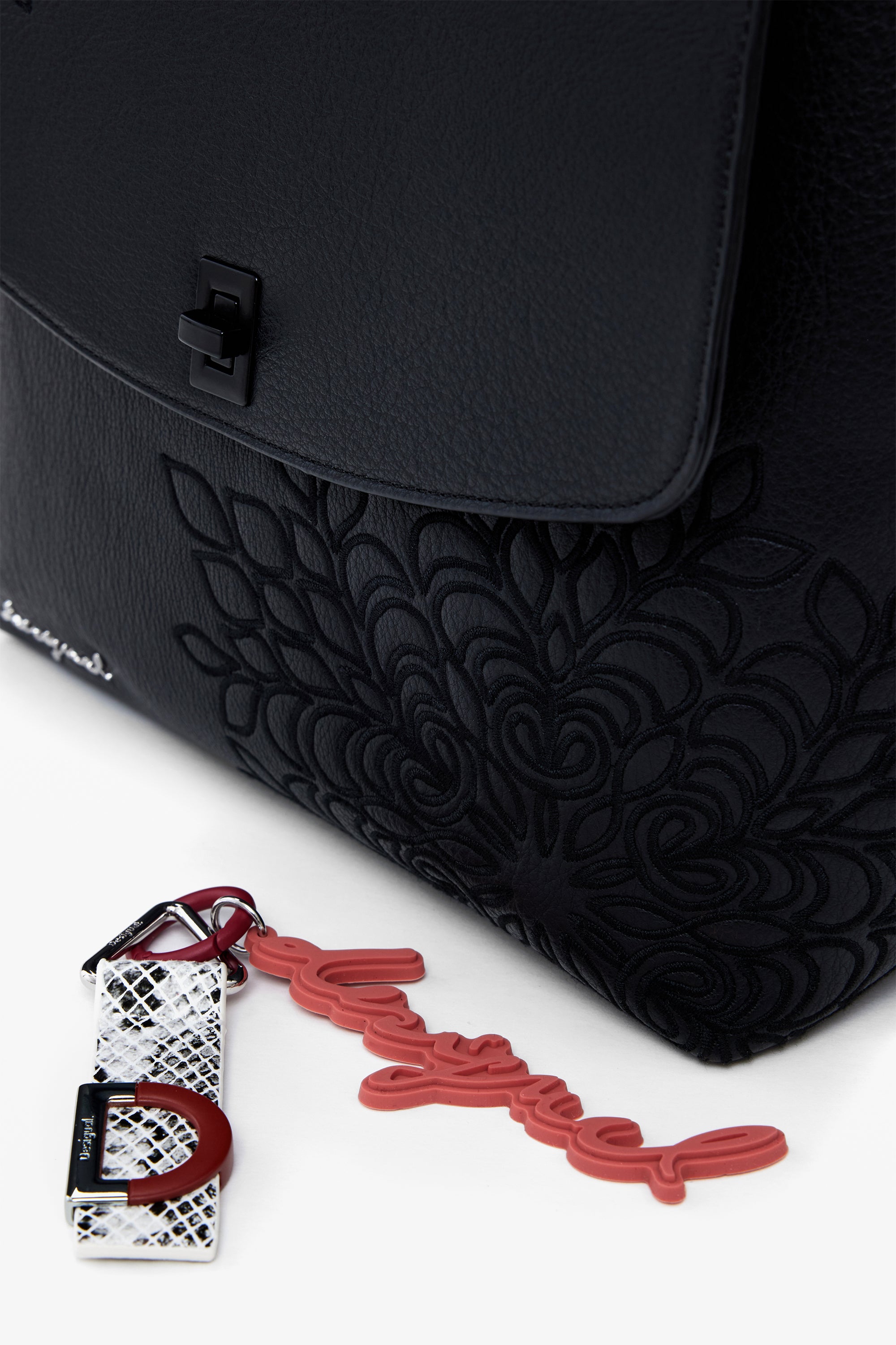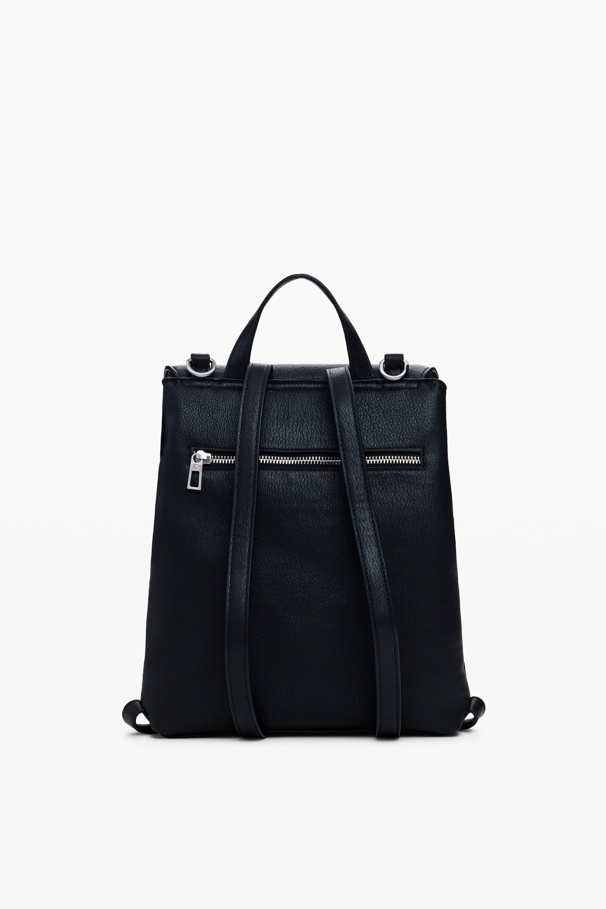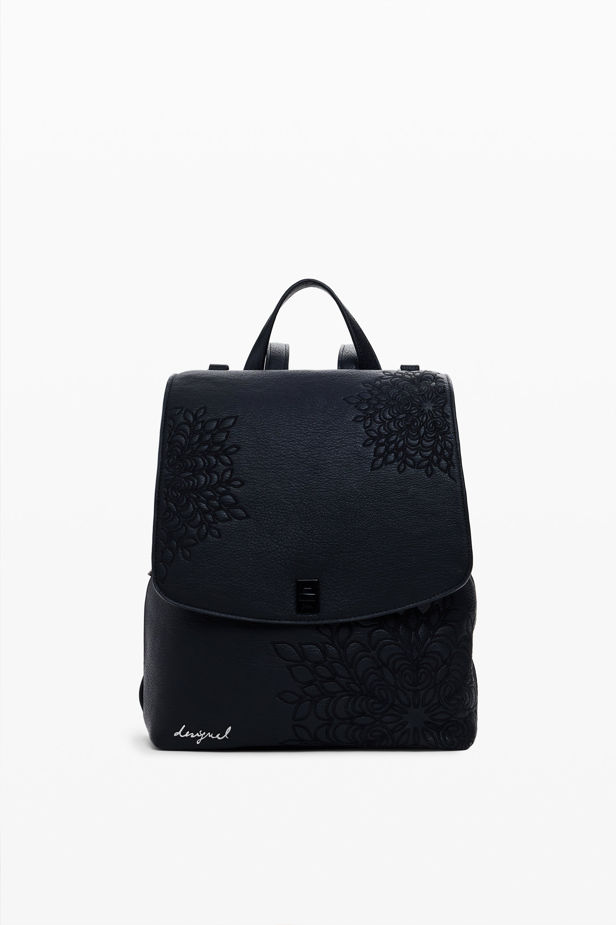 Rucsac mic din piele ecologică cu detalii mandala gravate, închidere cu fermoar și clapă mare cu mâner detașabil, transformabil în geantă.