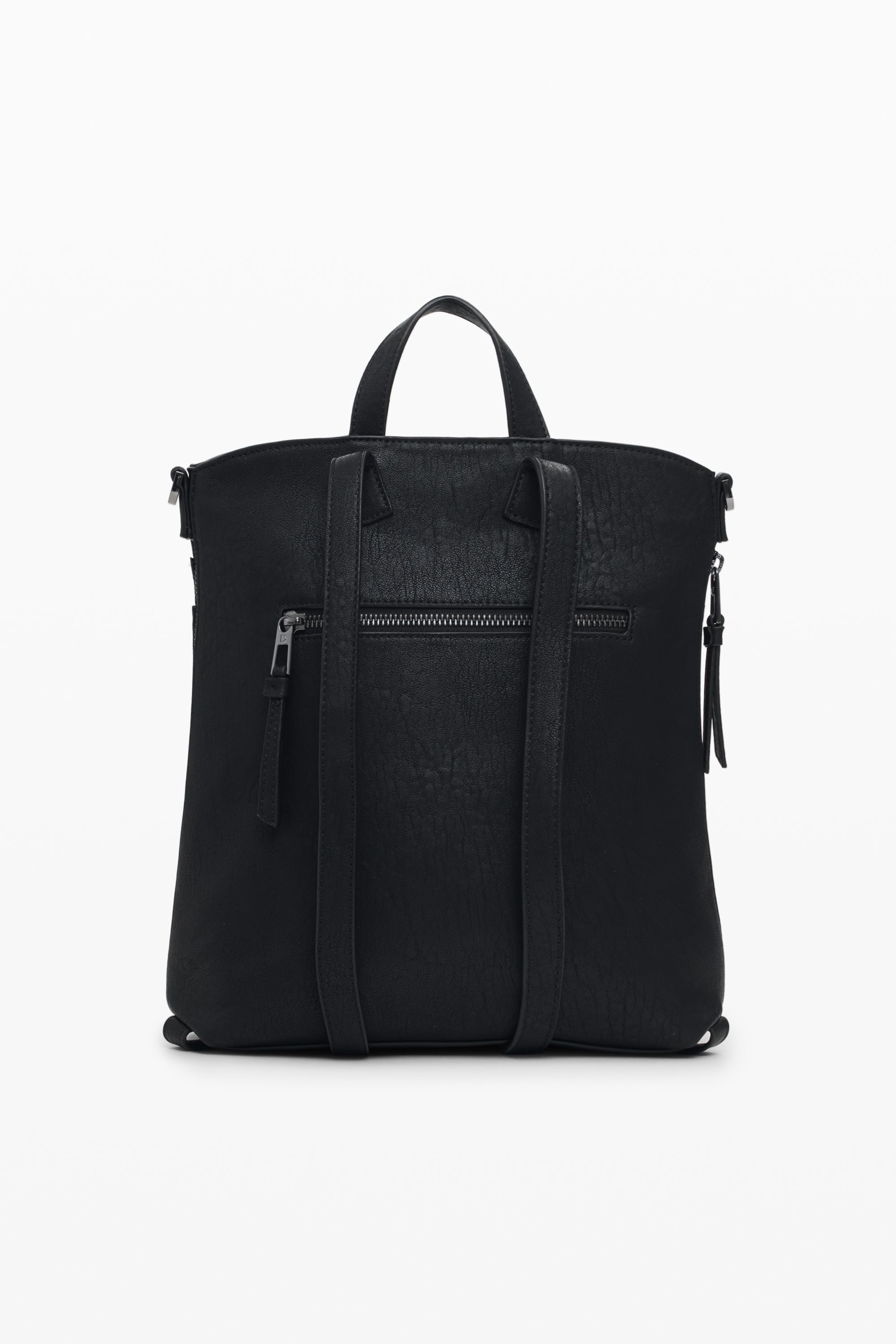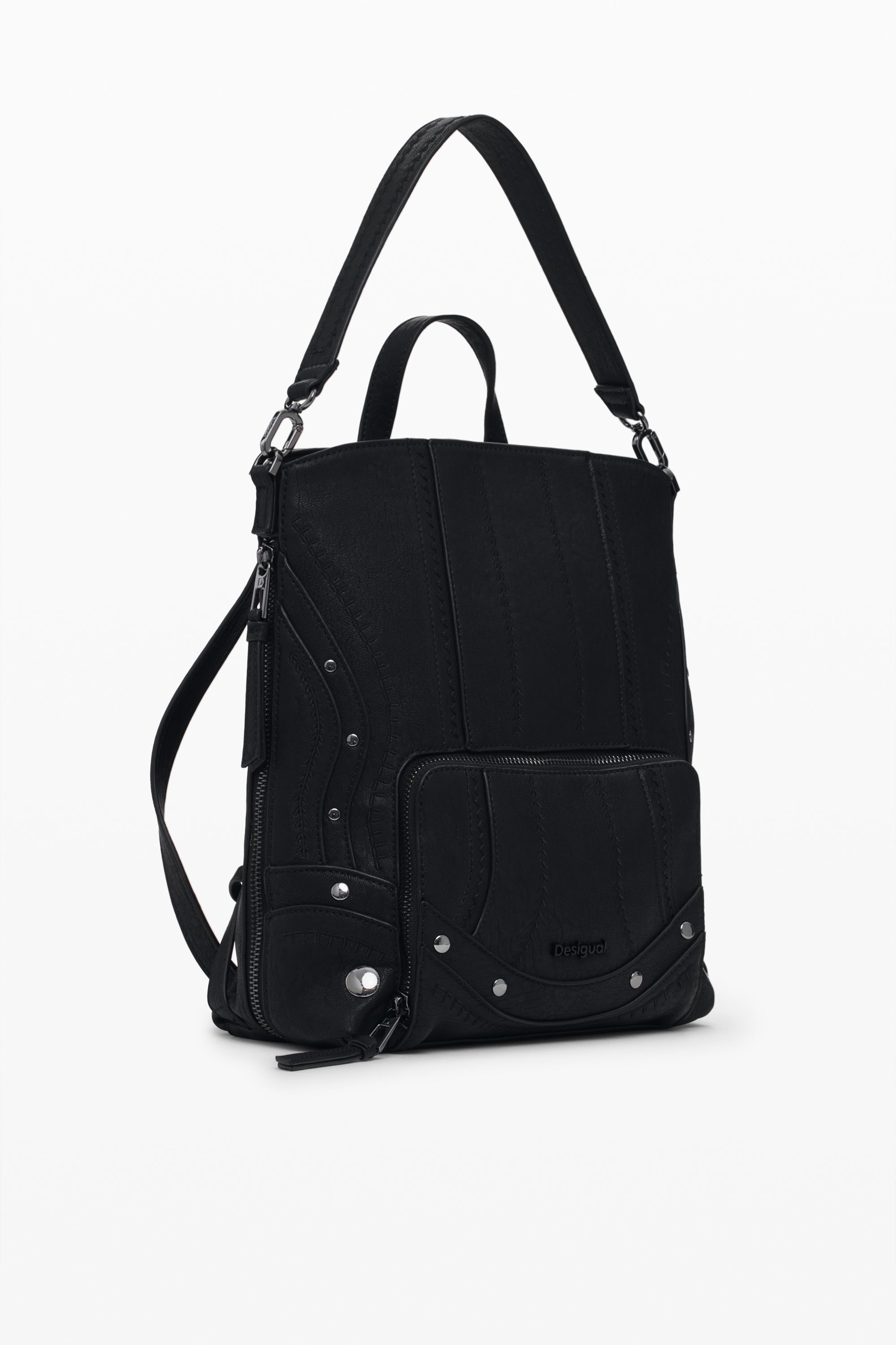Rucsac mic din piele ecologică cu broderie în material cu efect de etichete, detalii metalice cu ținte și mâner detașabil, tip geantă de mână.
