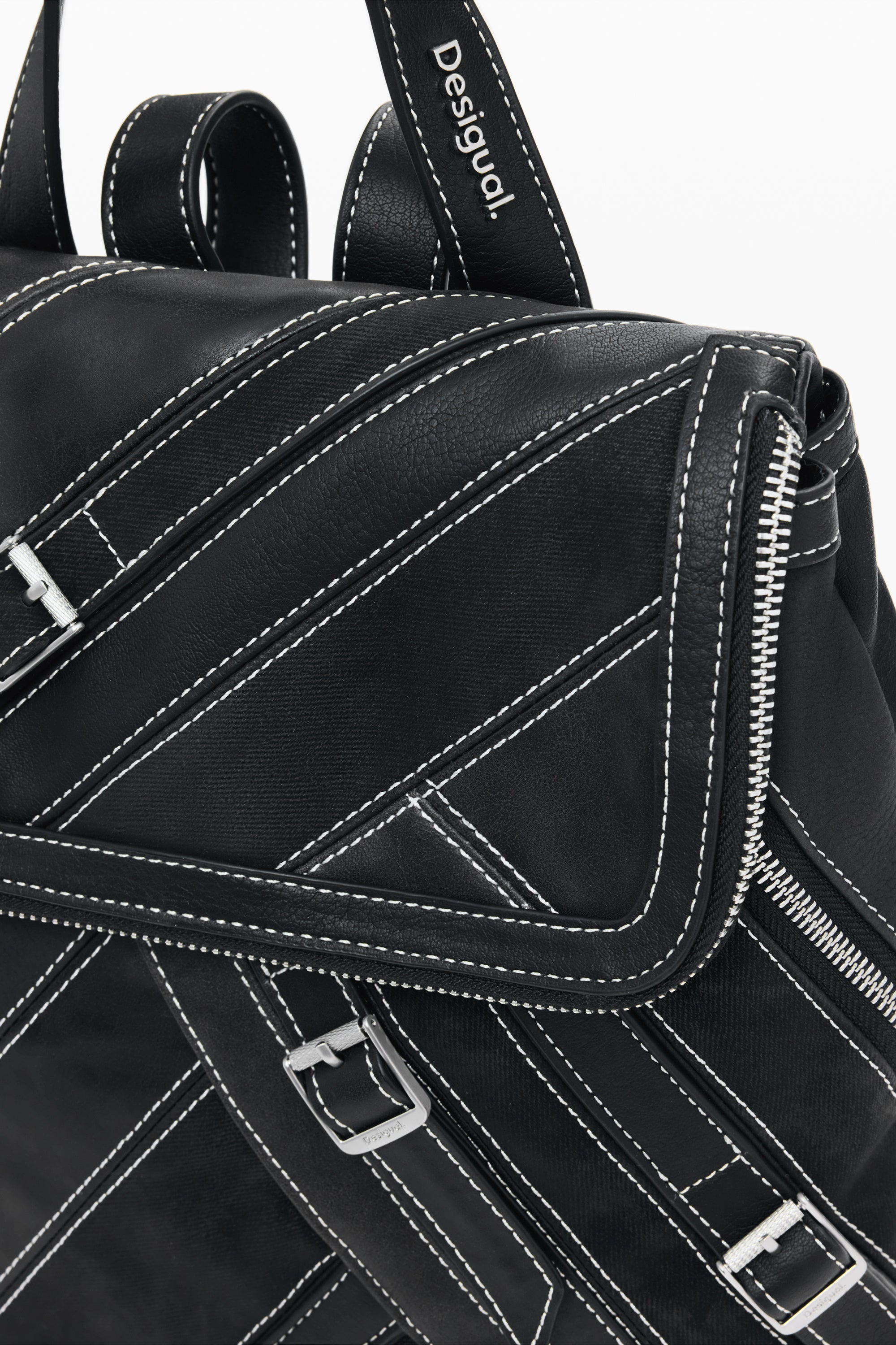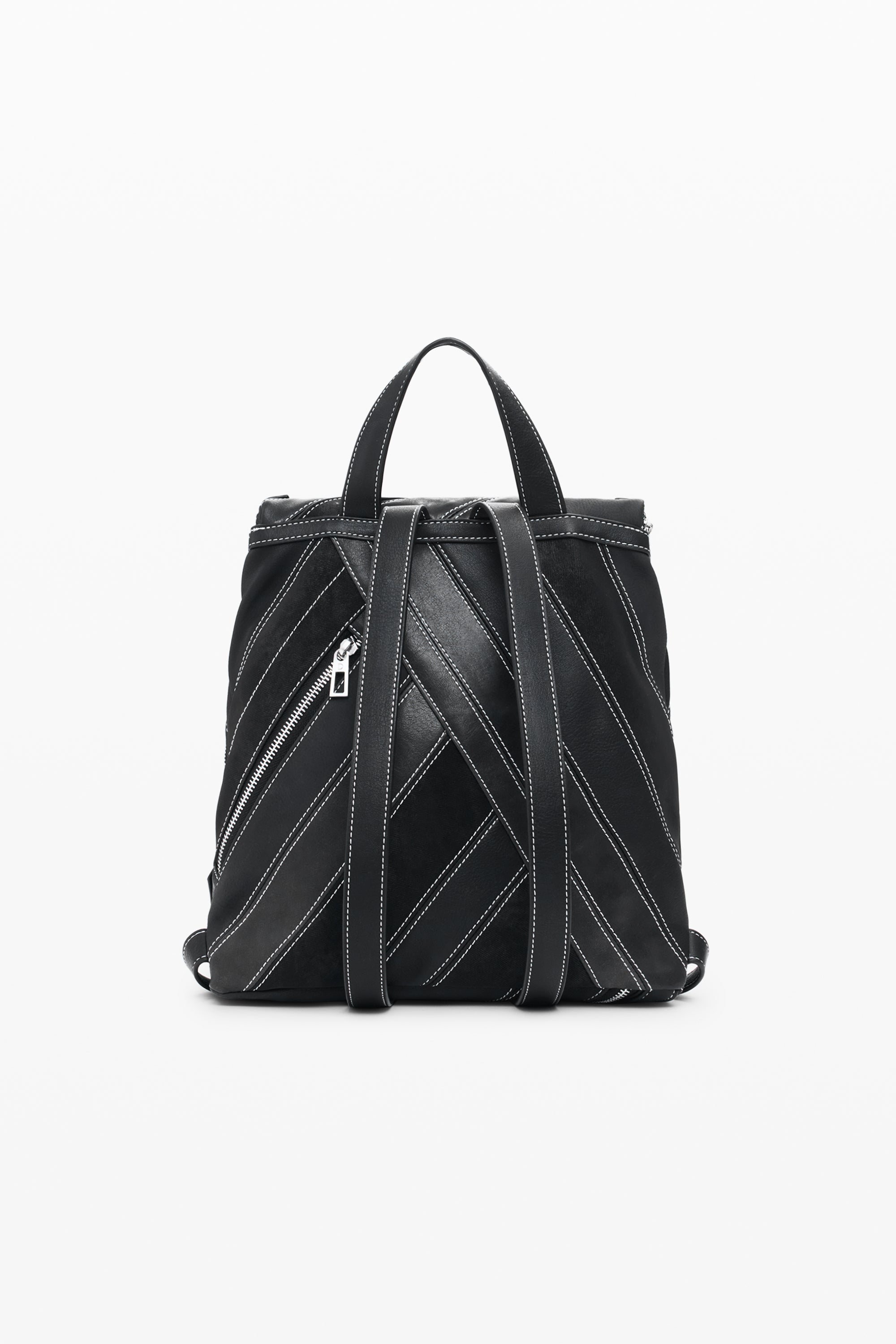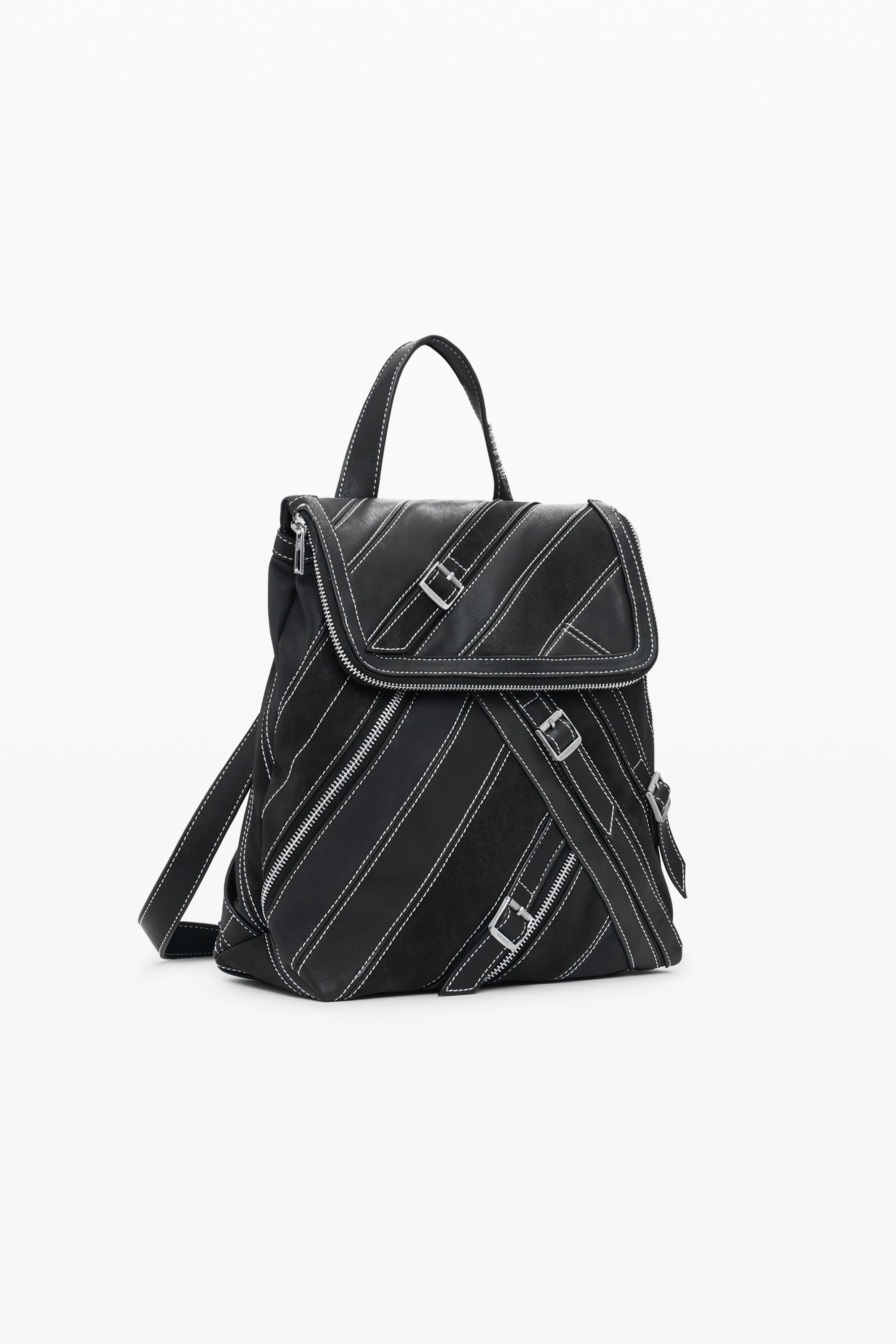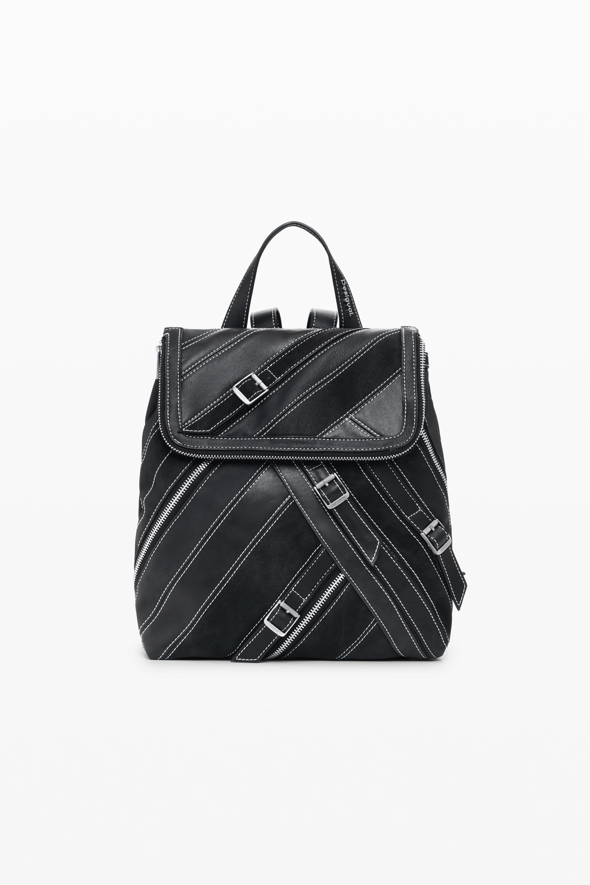 Rucsac mic din piele ecologică, cu clapă și detalii de fermoare, cusături și catarame.