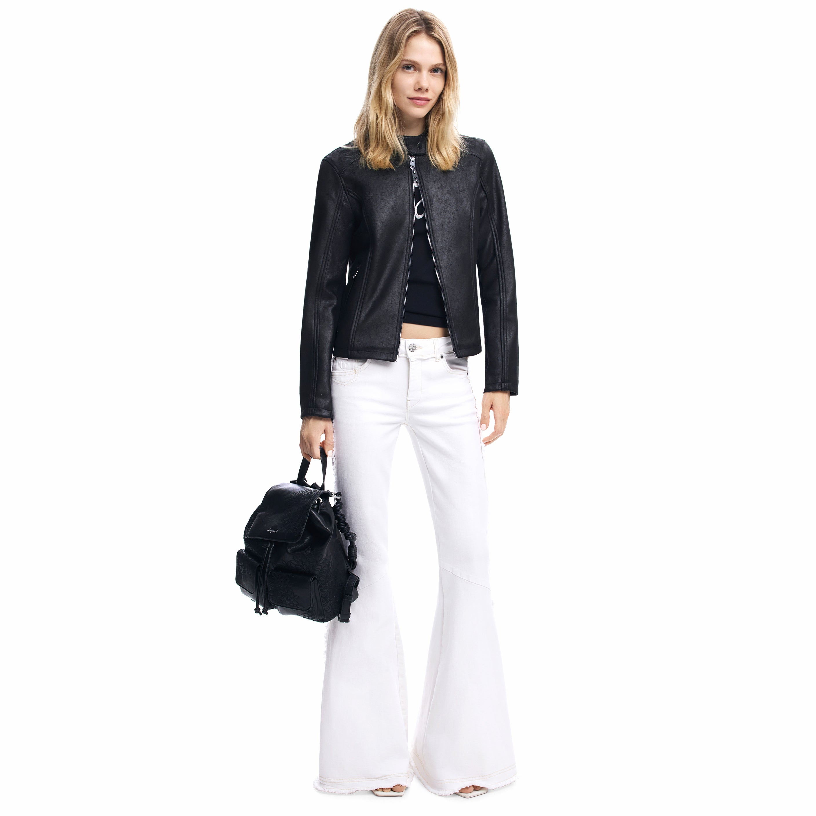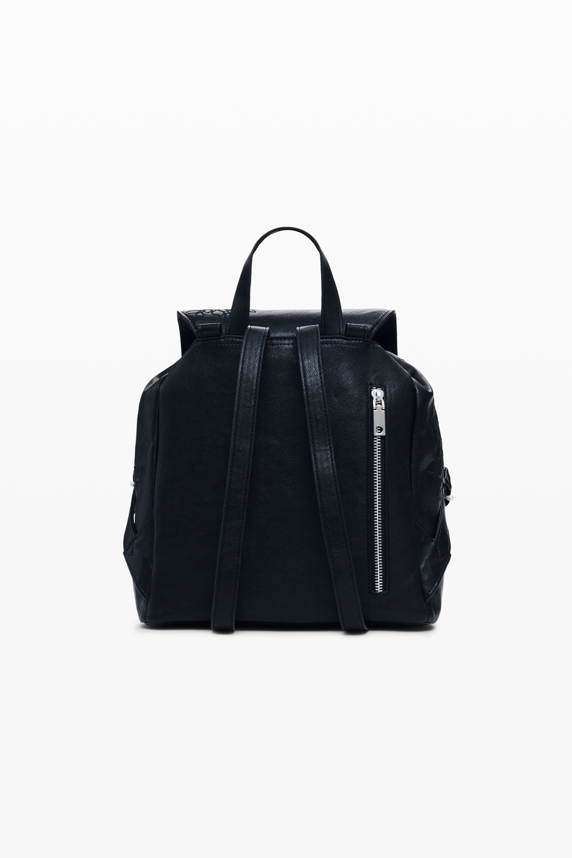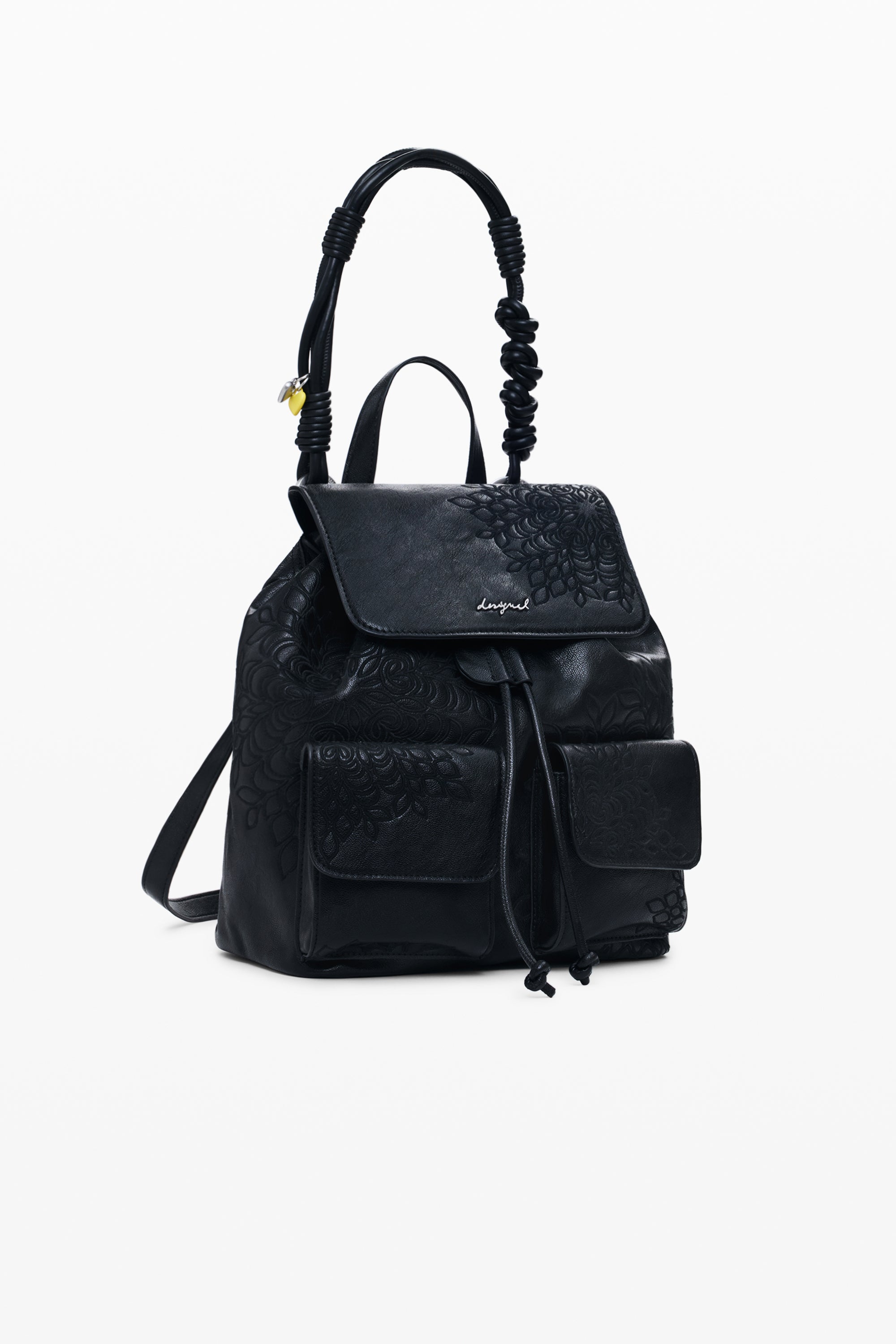 Rucsac mic cu clapă, detalii brodate, buzunare frontale și mâner detașabil cu brelocuri.