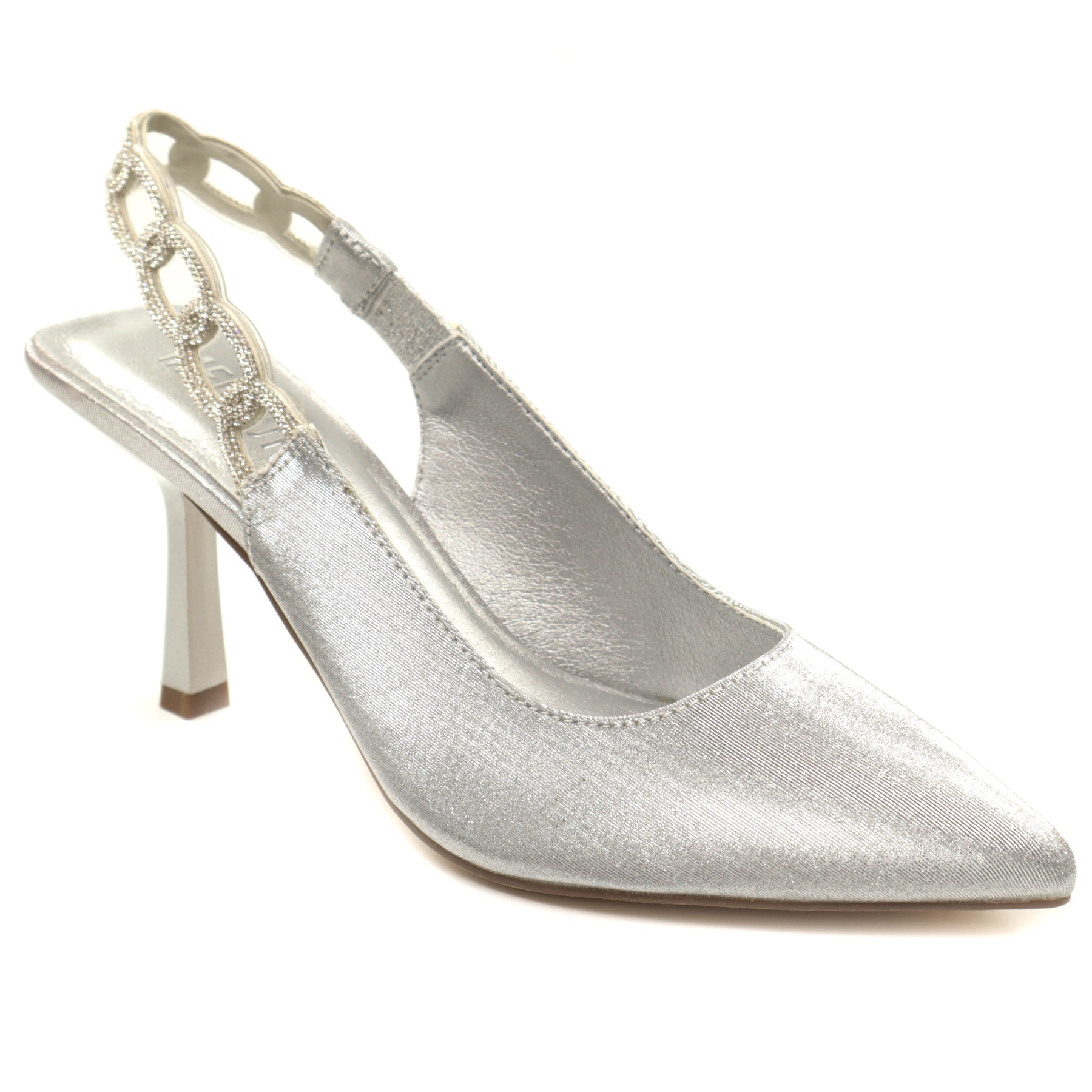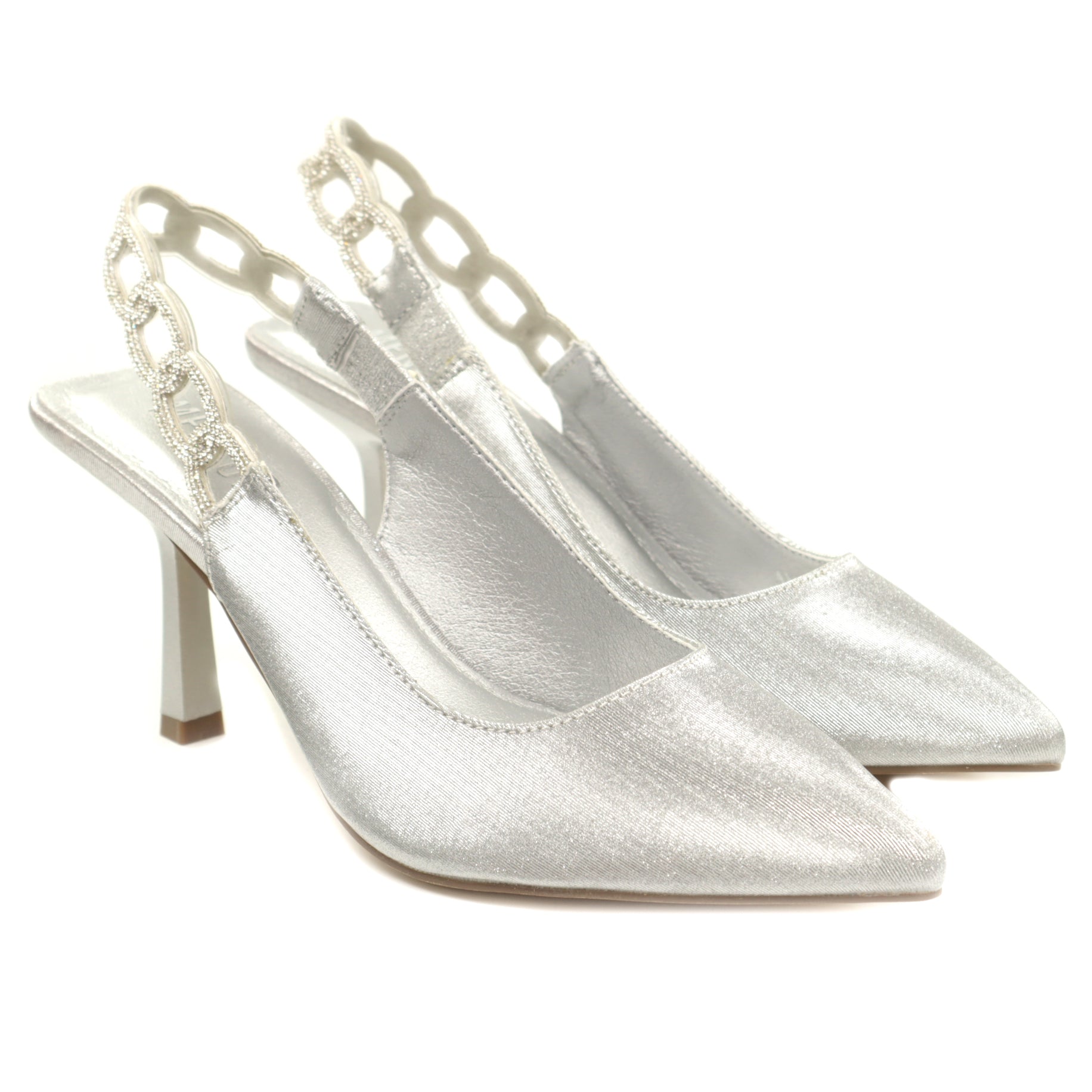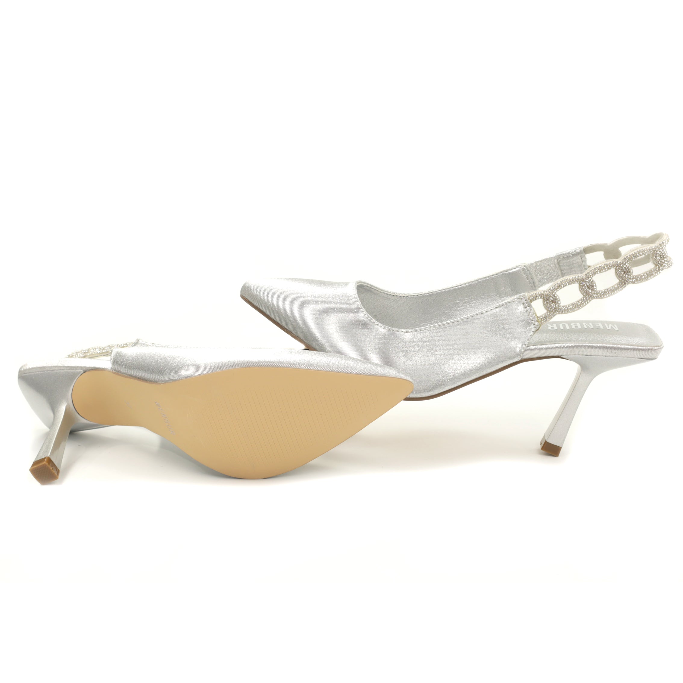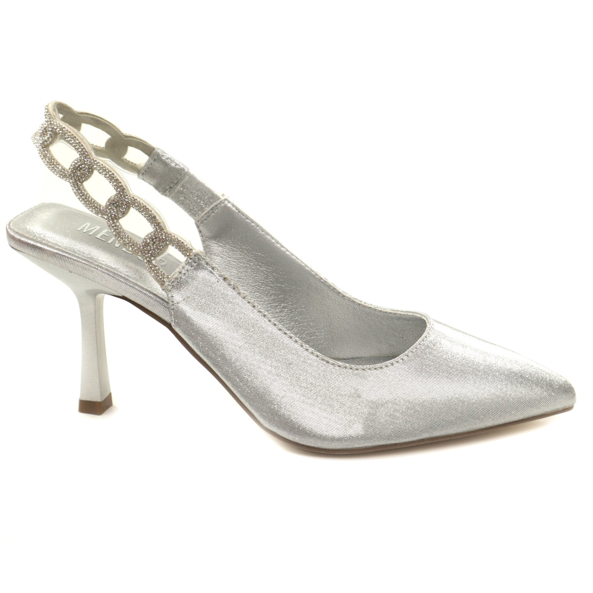 Pantofi eleganți Menbur realizați din piele ecologică cu finisaj metalizat, perfecți pentru ocazii speciale sau evenimente de seară. Designul tip slingback, cu vârf ascuțit, alungește vizual piciorul și oferă un plus de rafinament. Bareta din spate este decorată cu aplicații strălucitoare, adăugând o notă glam și sofisticată întregii ținute.