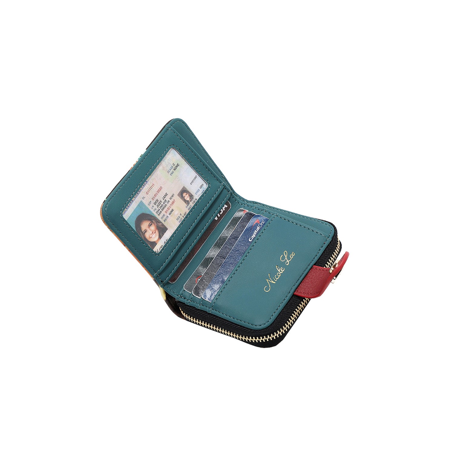 Compartimentul din spate se deschide cu fermoar și oferă 2 sloturi interioare pentru notițe și 9 sloturi pentru carduri în stil acordeon (Poate conține până la 25 de carduri)