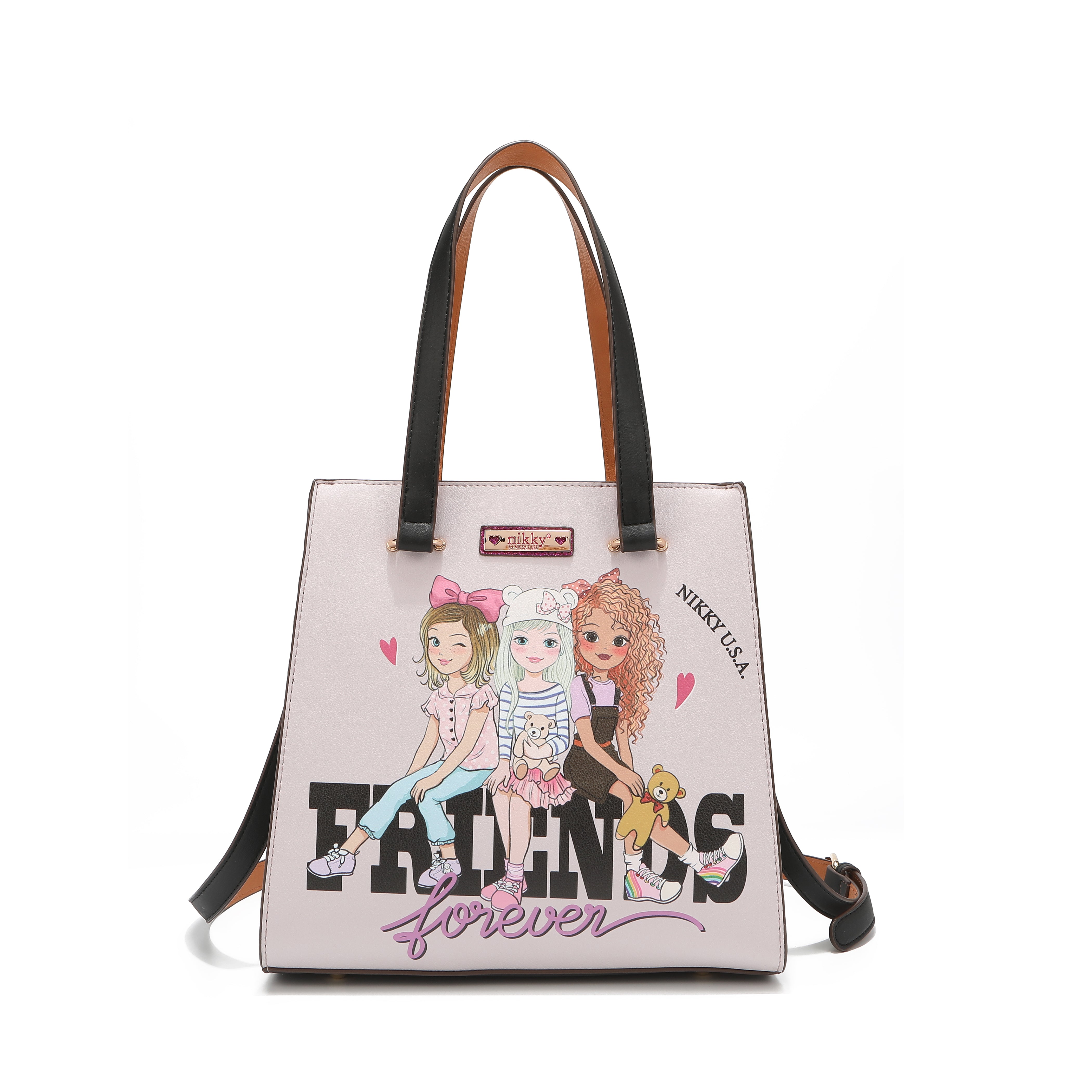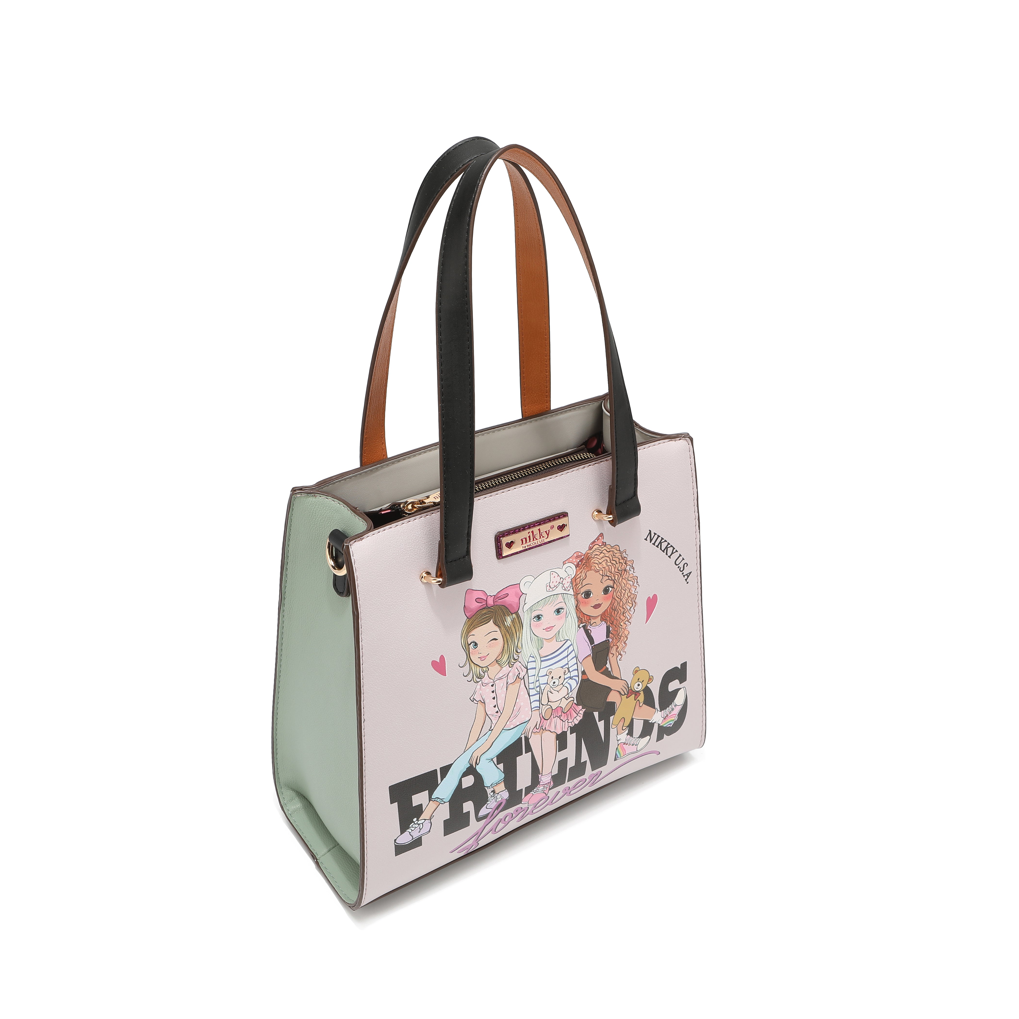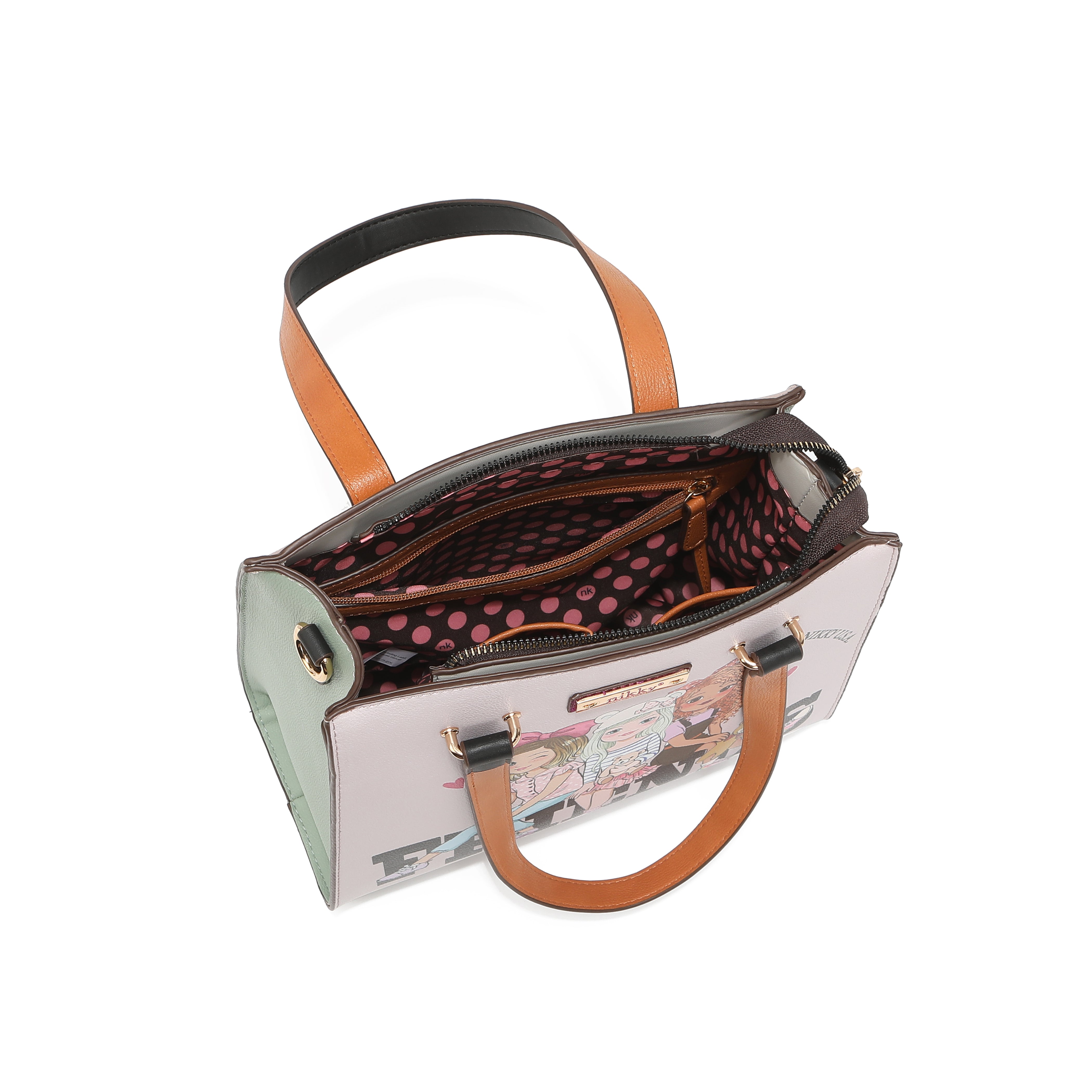 Închidere principală cu fermoar și logoNikkyîn nuanță aurie gravată pe clanțele fermoarului.