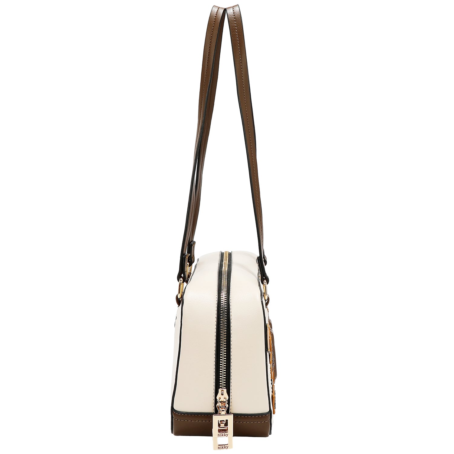 Plăcuță de identificare cu logo Nikky gravat în nuanță aurie, în față.