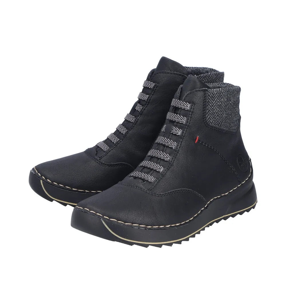 Aceste ghete RIEKER combină designul modern cu caracterul practic, decorate cu detalii subtile precum linii cusute și un logo discret al mărcii, creând un aspect impresionant. Închiderea șiretului împreună cu fermoarul lateral asigură o încălțare ușoară și se adaptează perfect formei piciorului. Brantul interior textil plăcut oferă confort, în timp ce talpa absorbantă de șocuri contribuie la stabilitate și confort la mers. Aceste ghete sunt o alegere excelentă pentru purtarea de zi cu zi, ideali pentru femeile care preferă încălțămintea elegantă și funcțională.